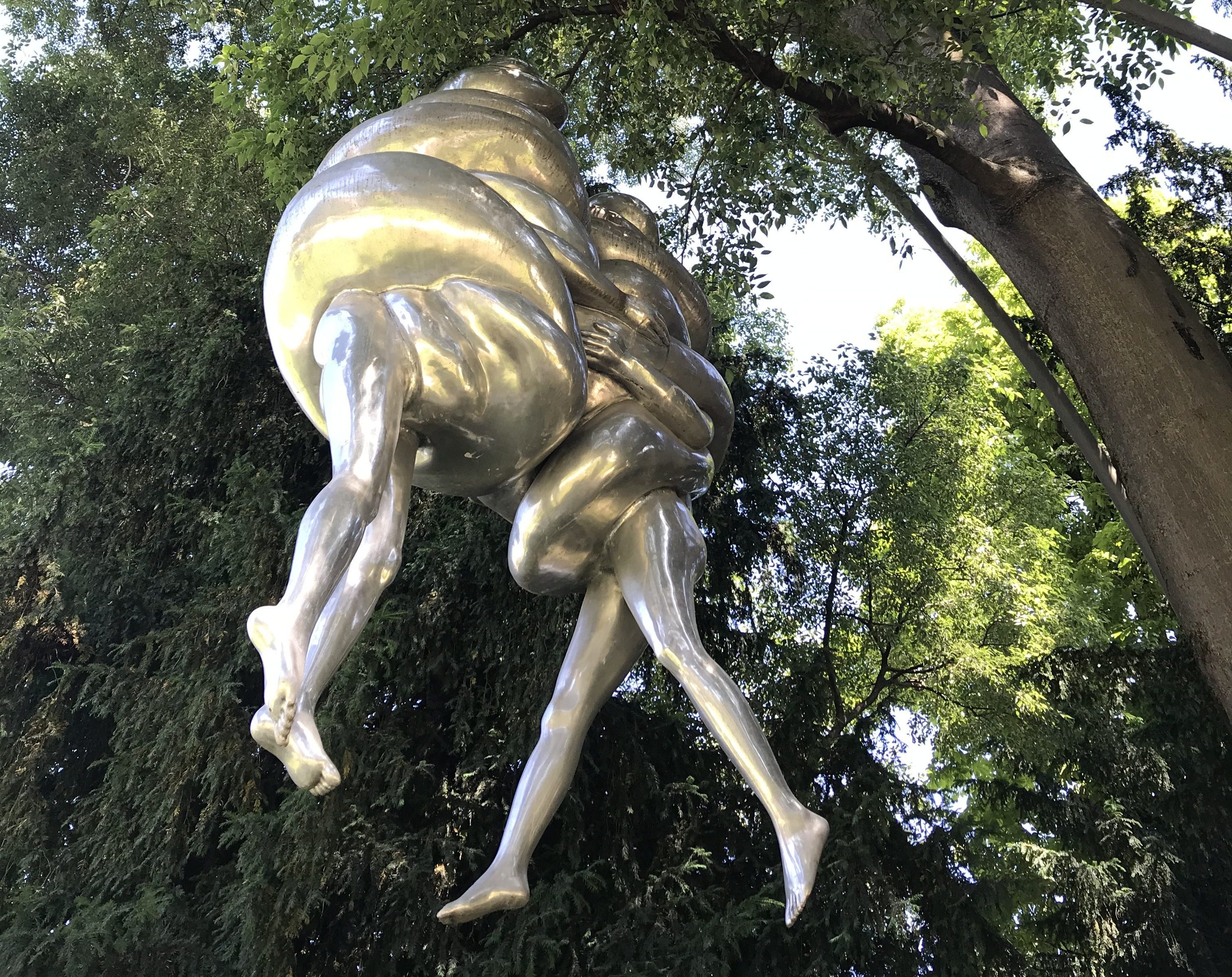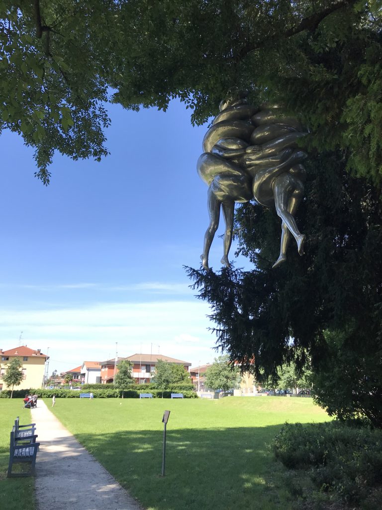 L’opera è stata conclusa nel 2003 ma conoscerà il proprio spazio nel territorio di Origgio soltanto nel 2016, a sei anni dalla morte di Louise Bourgeois, che non potrà quindi vedere il suo lavoro esposto. L’artista aveva concepito il lavoro esclusivamente per il parco della piccola cittadina: la scultura, infatti, avrebbe dovuto stagliarsi tra le chiome degli alberi, oscillando tra le foglie e i rami; e così è stato. La coppia prende il nome di gravità trasformata in leggerezza: la scultura pesa circa 635 kg e incarna un abbraccio di due amanti che si fondono nell’intimità del loro gesto. Ed è proprio nell’abbraccio e nell’abbondanza della carne che la materia perde potenza per lasciare spazio al pathos dei corpi che in questa tensione plastica oscillano in un vortice continuo che sembra accompagnarli verso l’infinito. Le figure, una nelle braccia dell’altra, si trovano in uno stato precario e fragile ma nonostante questo, nulla potrà separarli nel loro sostenersi a vicenda; incastrati insieme, vorticano per l’eternità.