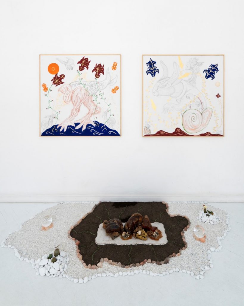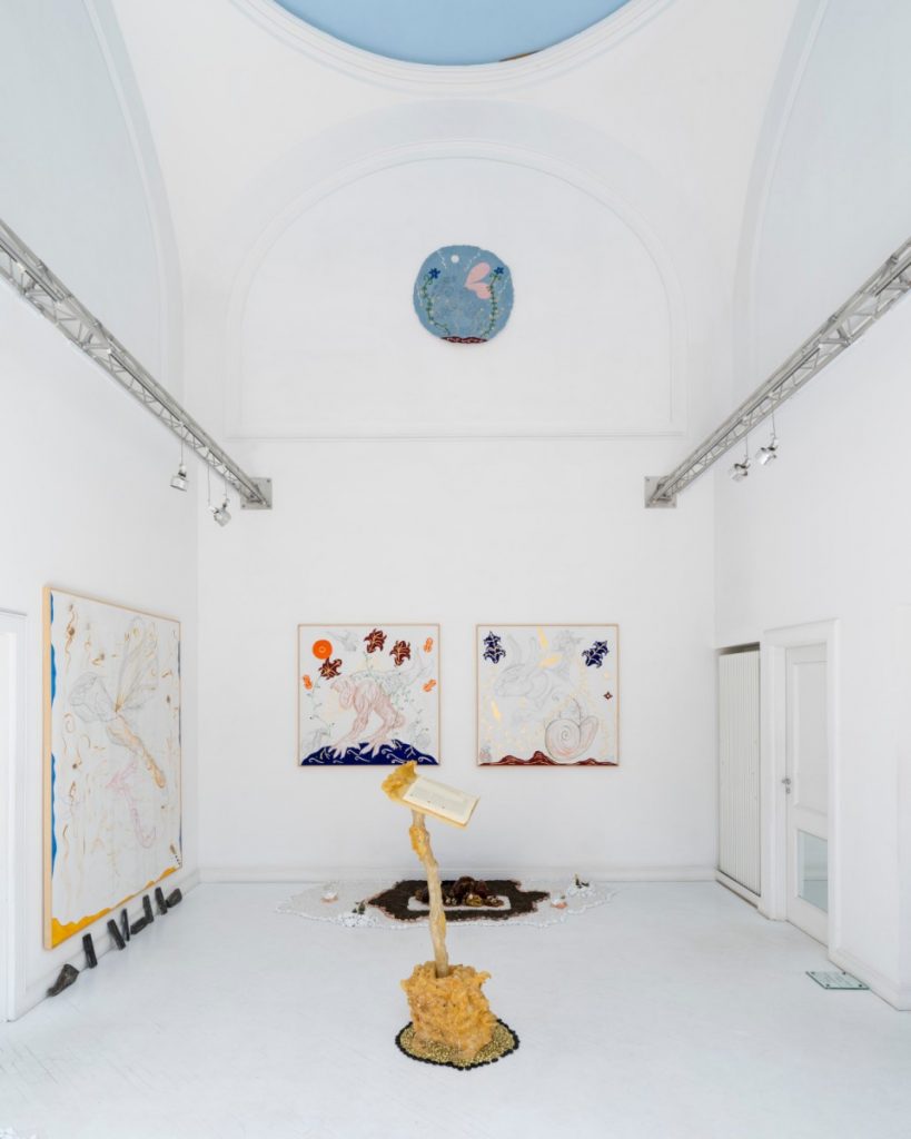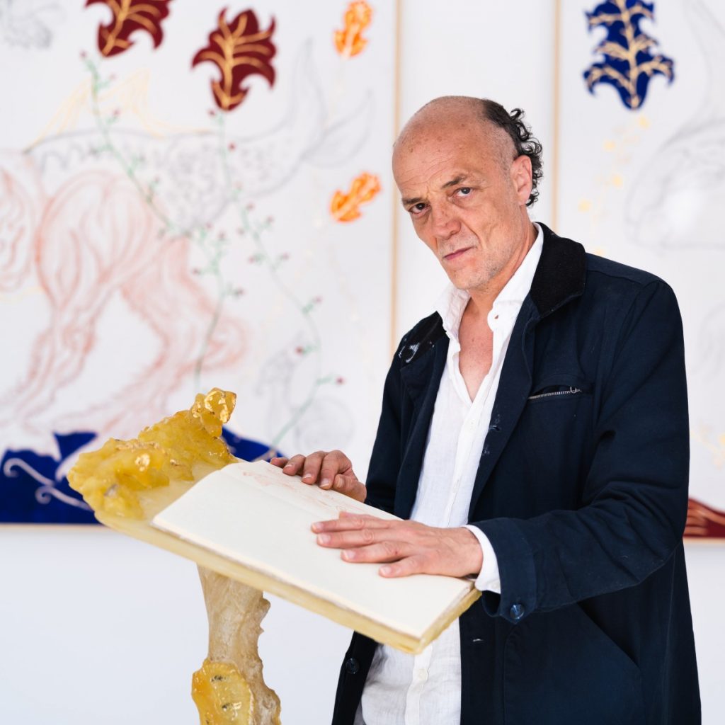 «L’aspetto polimaterico è molto importante perché l’effetto sensoriale è fondamentale, dal tatto agli odori e al gusto; tutto ruota intorno all’estensione biologica di queste creature che popolano il mio mondo. Sono personaggi aristocratici, una razza di artisti che si è auto-evoluta attraverso una manipolazione genetica fino a diventare dei perfetti demiurghi che lavorano sia sulla materia inorganica sia su quella vivente; essi quindi trasformano il mondo in base a quello che è il loro capriccio estetico ed in questo c’è una totale e continua dimensione barocca e di riferimenti al mondo rinascimentale, all’idea di arte e natura mescolate insieme ma proiettate all’interno di un universo iper-tecnologico.