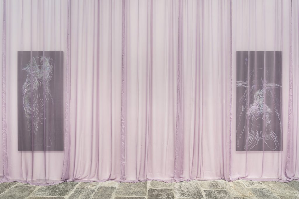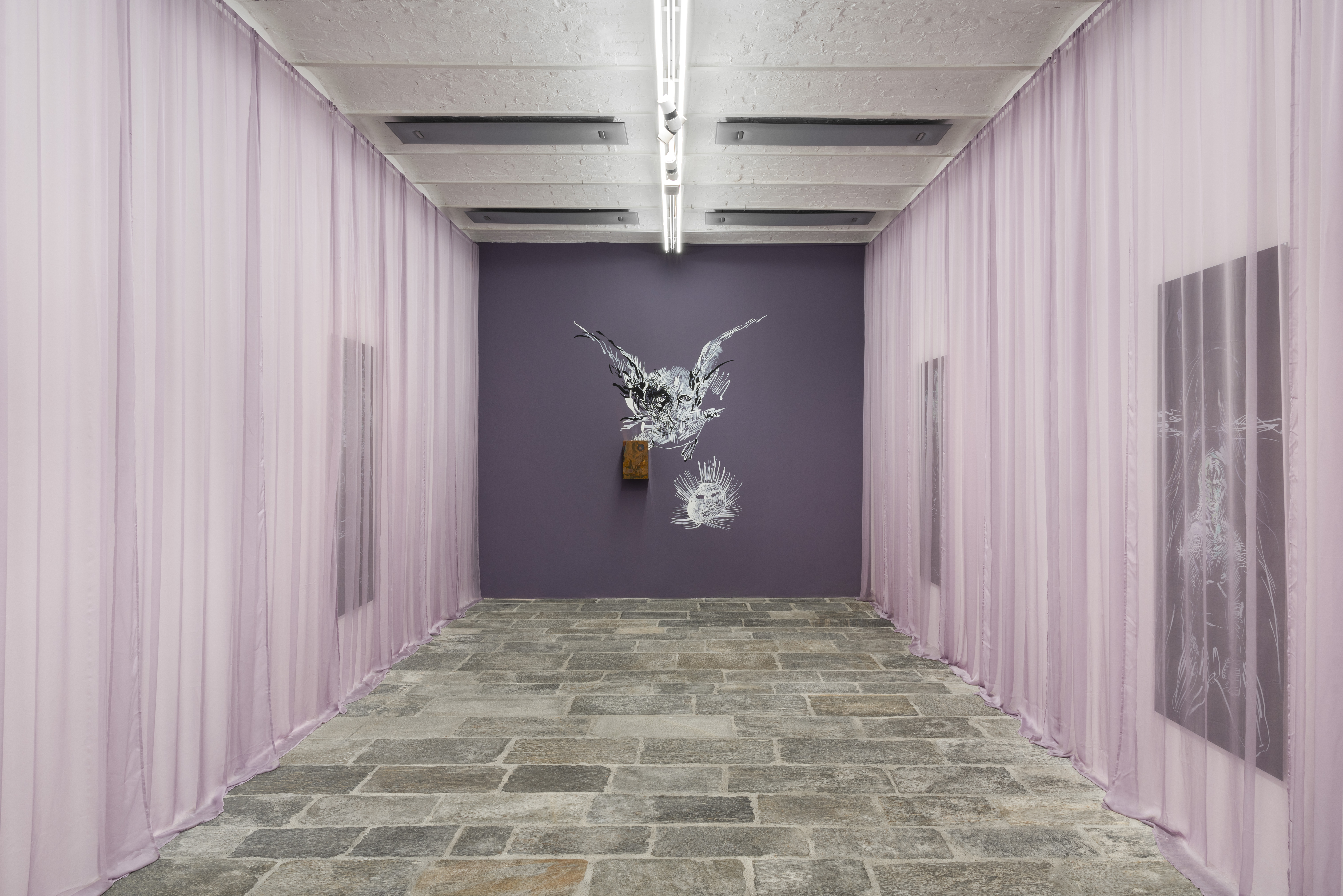 Il pubblico è invitato ad addentrarsi in un ambiente intimo e spaesante, le cui pareti sono coperte da tende lilla che lasciano intravedere, in un continuo gioco di stratificazioni, sculture e disegni. Tra questi ci sono il corpus inedito The Purple Chamber series (2023) e un imponente wall painting – realizzati appositamente per la mostra – e alcune opere precedenti, come Sans titre (ombre blanche) (2020) e You & I (fallen orbiters) (2023). Nel loro insieme i lavori compongono un intenso dialogo tra corpo e superficie materica che scandisce il ritmo espositivo e trascende i limiti spazio-temporali. I disegni, realizzati con matita acrilica su pannelli di alluminio nero, traggono ispirazione dallo Psychomanteum, una stanza buia utilizzata da medium o sensitivi nel tentativo di entrare in dialogo con i morti attraverso uno specchio scuro. La superficie riflettente, qui restituita grazie all’alluminio nero dei pannelli, ha lo scopo di permettere l’apparizione spontanea di immagini e figure provenienti dall’aldilà, che l’artista evoca attraverso i disegni, confondendo il confine tra i vivi e i morti. I lavori possiedono una forte componente performativa che coinvolge il corpo dell’artista in un dialogo attivo con la superficie materica, similmente ad una coreografia e», come spiega la curatrice Chiara Nuzzi, «risultano da un processo di emersione, simile alla scrittura automatica, in cui le immagini non sono predeterminate né guidate intenzionalmente dall’artista, ma che nel processo di creazione si manifestano sulle superfici affiorando quasi inconsciamente».