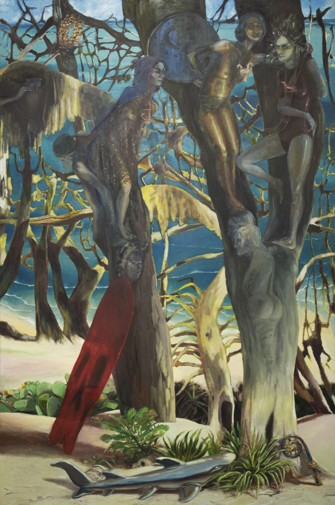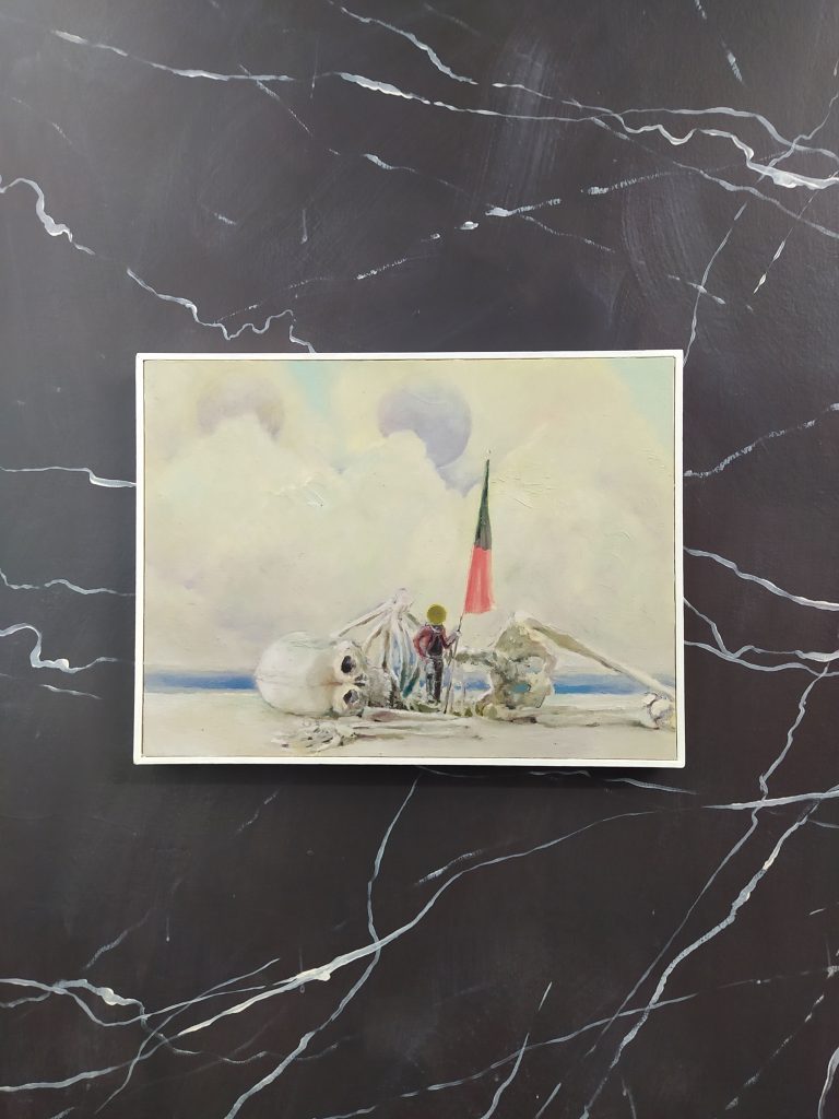 Così, ci troviamo davanti alle scene concertate dall’intenzione del pittore, dalla sua mente alla sua mano, dalle suggestioni del reale a una fantasia filtrante, alla tela. Come Carrabean you beyond Blue (2020), dove su una bianca spiaggia caraibica si trovano e si mimetizzano presenze e oggetti di cui notiamo sempre più, quanto più ne scopriamo i dettagli. Invece, più ironiche sono la spiaggia di Francesco non ama tenere al guinzaglio il cane (2020-2021) o la riva di Pisciatina ai laghi di Fusine (2021). Qui, i protagonisti sono gli scheletri vivi che, sembrando appena giunti da una danza macabra, mutuano il movimento dal ballo della morte per rappresentare le nostre quotidiane abitudini.