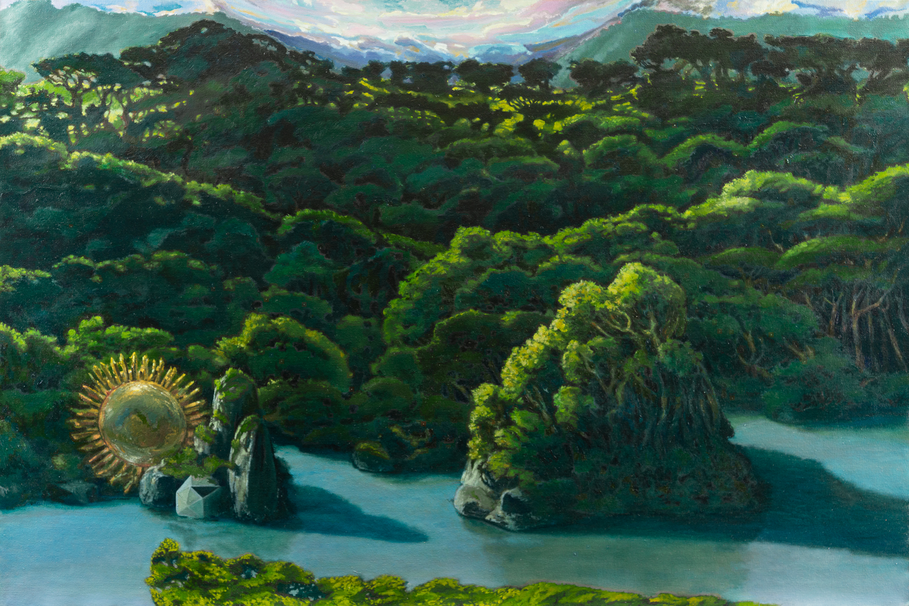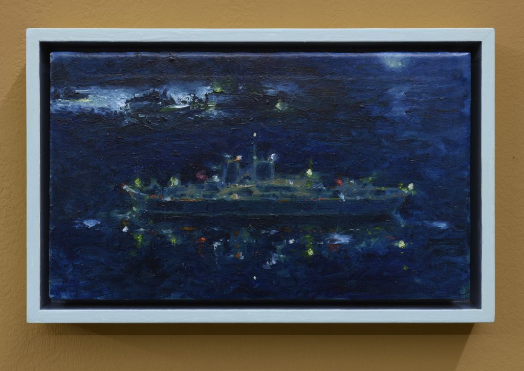 Thomas Braida, Minimum further deviation, 2020, olio su tavola, 21 x 34 cm. Courtesy l’artista e Monitor Roma, Lisbona, PeretoLa razionalità della linea lascia totalmente posto alla fluidità del colore, leggera e luminosa come i riflessi delle acque di Salvo per un pelo (2021). Però, è nelle tele più piccole di Thomas Braida esposte a Monitor che troviamo i sogni più grandi, ancora intrisi di quella propensione a viaggiare con la fantasia propria della tenera età, nonostante la diffidenza di quando si è diventati già un po’ grandi: Minimum further deviation (2020), Nuovo Mondo, New Planet Earth (2020).
