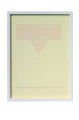 Nell’intento di approfondire il significato semiologico del lavoro di Tomaso Binga, la mostra “Scrivo di proprio pugno” – con un titolo che deriva proprio da uno scritto dell’artista – copre un ampio arco temporale, restituendo l’idea di una ricerca artistica sempre tesa tra corpo e lettera. Ricerca in cui il linguaggio è considerato da Binga da un punto di vista visivo, grafico e anche sonoro. Ne è esempio in mostra l’opera Introspezione-Riflessione-Ideazione-Azione (1977) in cui con il segno e la parola compaiono i tasti bianchi di un pianoforte, sineddoche di una sonorità interiore. Ancora la parola, insieme ai suoi significati, è protagonista dell’Alfabeto Tautologico (2020), anche questo esposto con tutti i suoi pezzi.