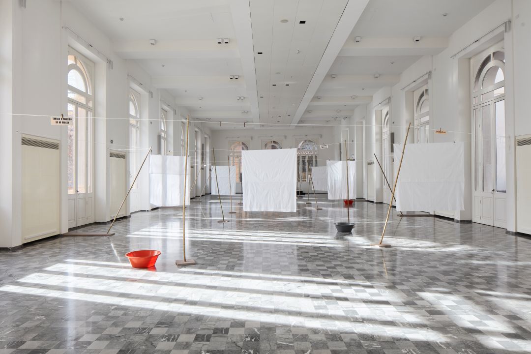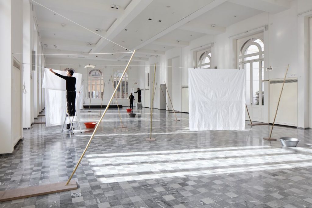 Quando i performer se ne vanno, l’installazione resta come una traccia: le lenzuola ferme, le corde tese. Il meccanismo continua a funzionare, ma in un’altra modalità.