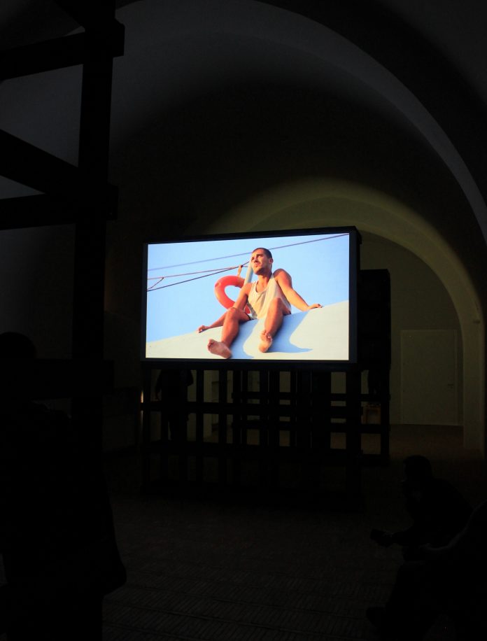 Invece, la seconda costruzione, in combinazione con la sequenza delle quarantuno carte, è una grande torre rossa a cuspide piramidale, nel cui interno è trasmesso il video Dicta I, 2017: recitazione di una poesia composta da Očko con frammenti tratti da un testo di Bertolt Brecht del 1935 sull’importanza e la difficoltà di scrivere la verità. Ciò che si offre allo sguardo è l’esecuzione di un discorso poetico dadaista. Le parole di Brecht, allontanate dal loro contesto, sono recitate come proclami privi di senso, che intessono una drammaturgia compositiva. Dicta I esprime “fatti alternativi”, ovvero un senso di verità a partire da informazioni completamente false, ammiccando alle forme manipolative del mimetismo in funzione nel discorso politico. I primi piani del volto nel video conferiscono una sensazione molto fisica e umana alle immagini che, associate al riverbero della voce e del suono dalla torre in legno, emanano intensità allo spazio dell’ex chiesa.
