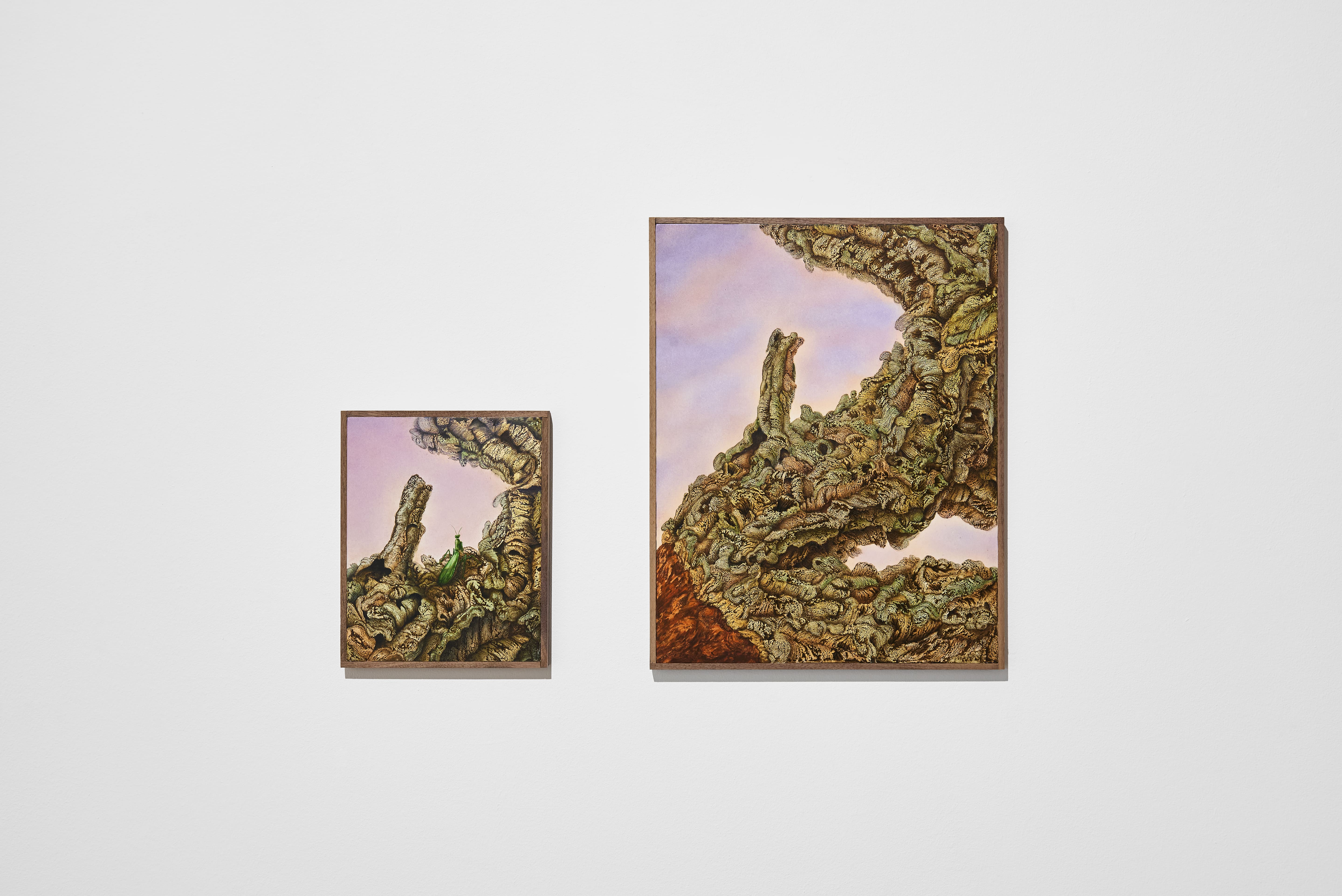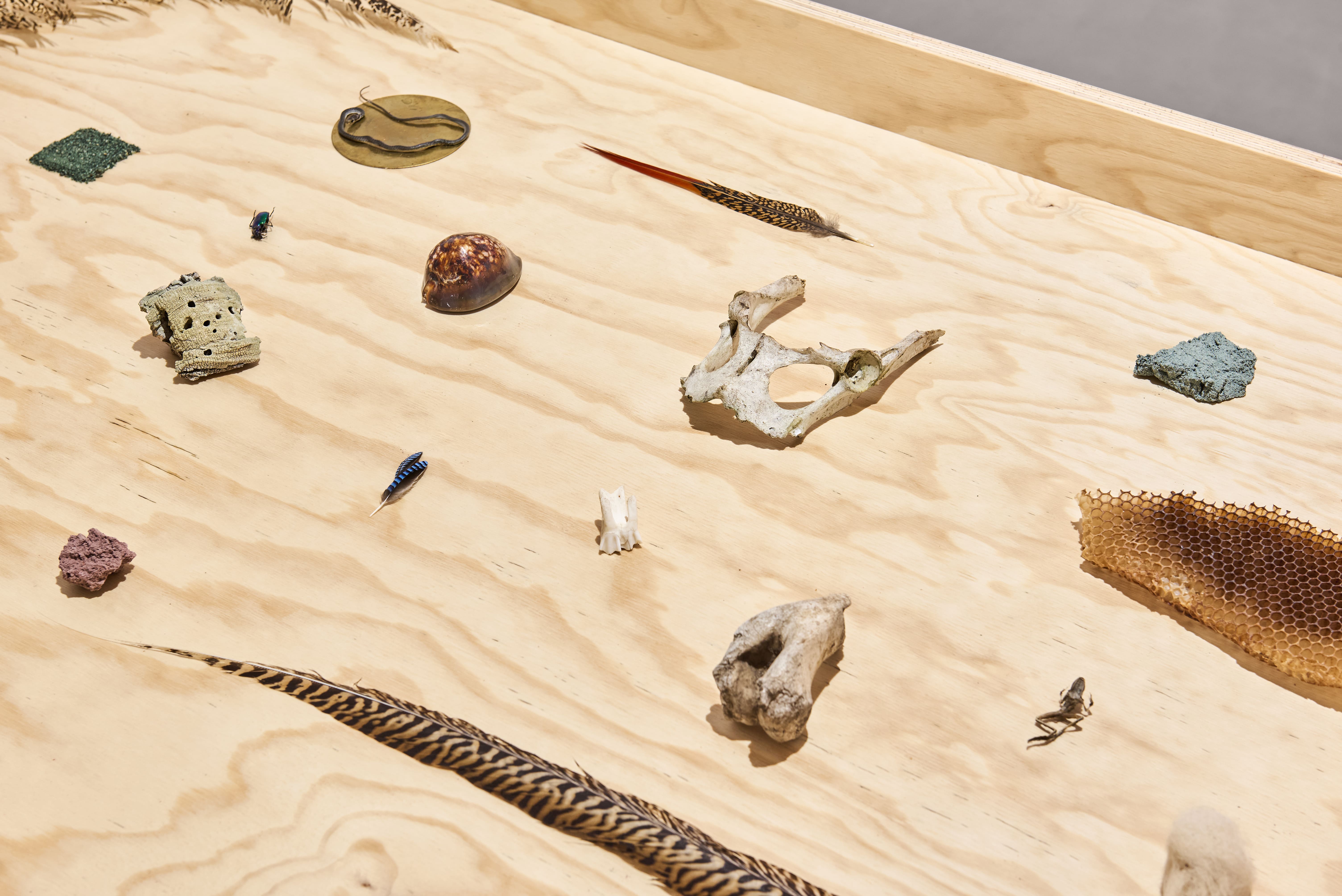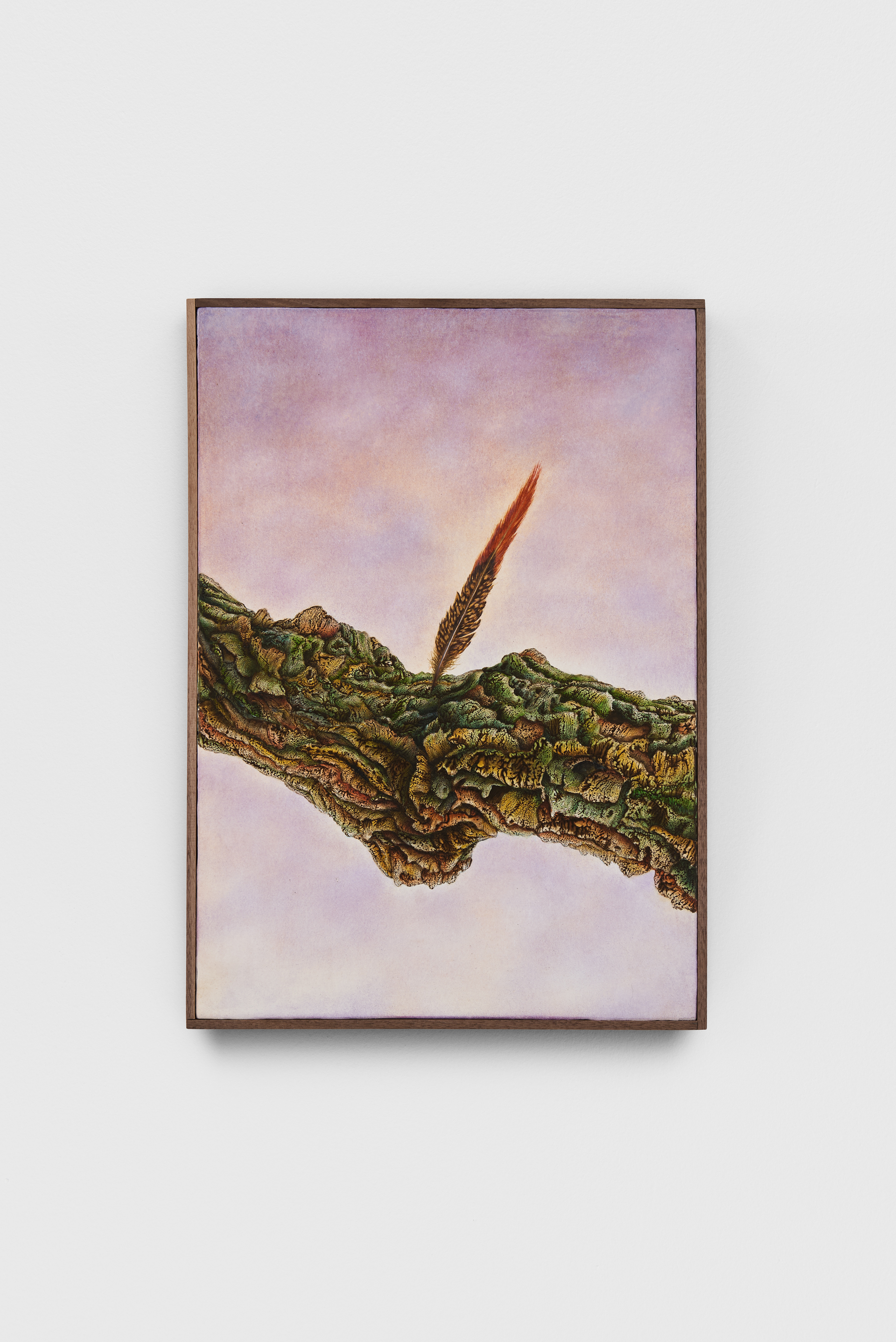 Le ambientazioni rappresentate da Pietro Fachini, nelle tele che aprono la mostra da ArtNoble Gallery, si ispirano ai boschi di sughere in Sardegna. Importanti sono la ricerca e l’analisi di minerali, vegetali e animali, trasposti minuziosamente nelle opere. In questi ecosistemi, piccole piume e insetti si manifestano in un contesto onirico e fantastico. Un esempio di queste ricerche è Mantide (Predatrice di calma) (2024), in cui il tempo sembra essere sospeso, quasi in attesa di un futuro avvenimento. Leticia (2024), testimonianza delle analisi in Amazzonia, è un campionario delle terre e dei pigmenti rintracciati durante le ricerche dell’artista che si è interfacciato con le popolazioni del posto. Le stesse terre naturali sono protagoniste dei monotipi dai caratteri ancestrali, appartenenti alla serie Pastore delle nuvole (2024). Come un archeologo durante la fase dell’inventario, Fachini ha raccolto alcuni dei reperti, come piume, sugheri, ossa, terre e piccoli animali, disponendoli nel Tavolo d’archivio.