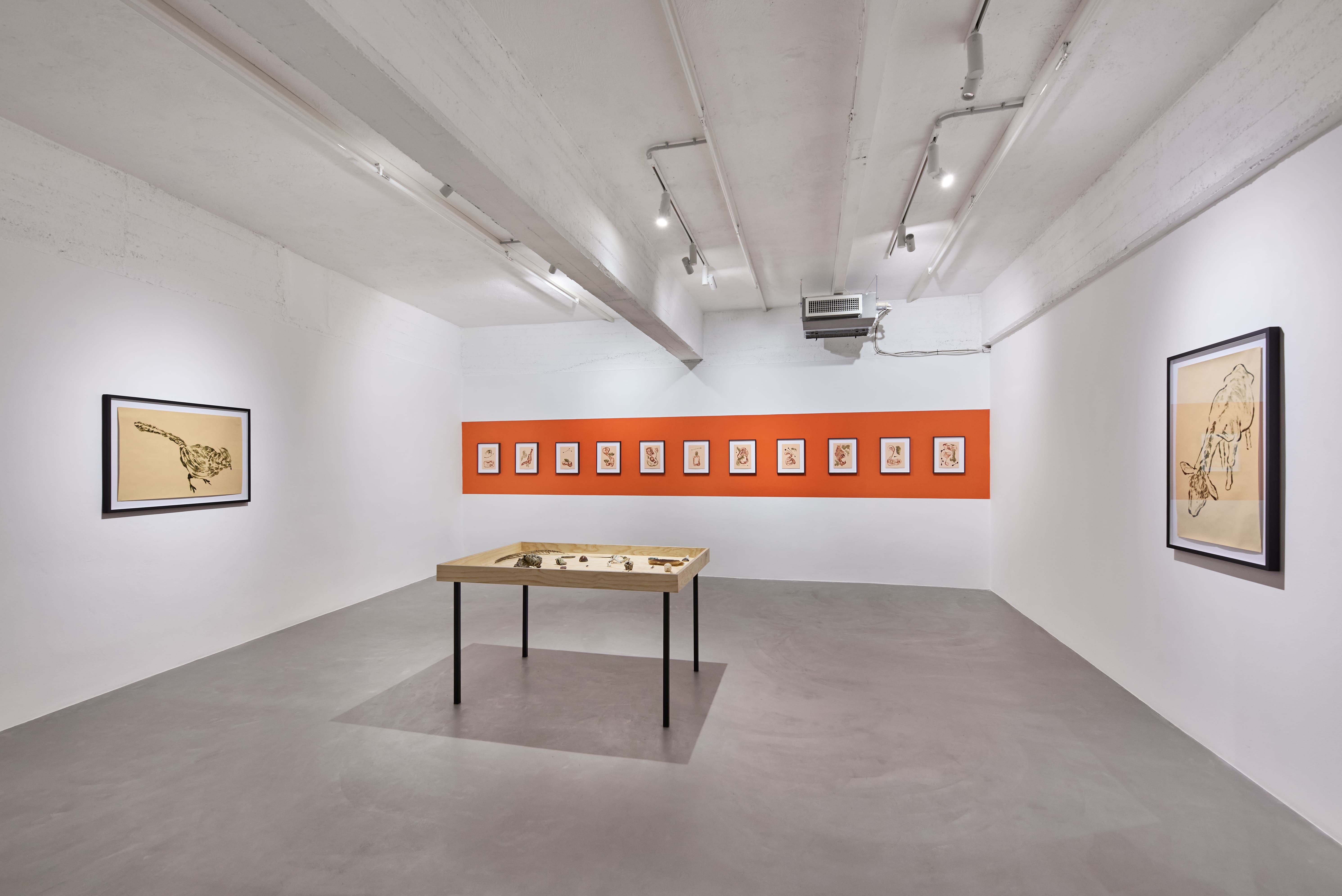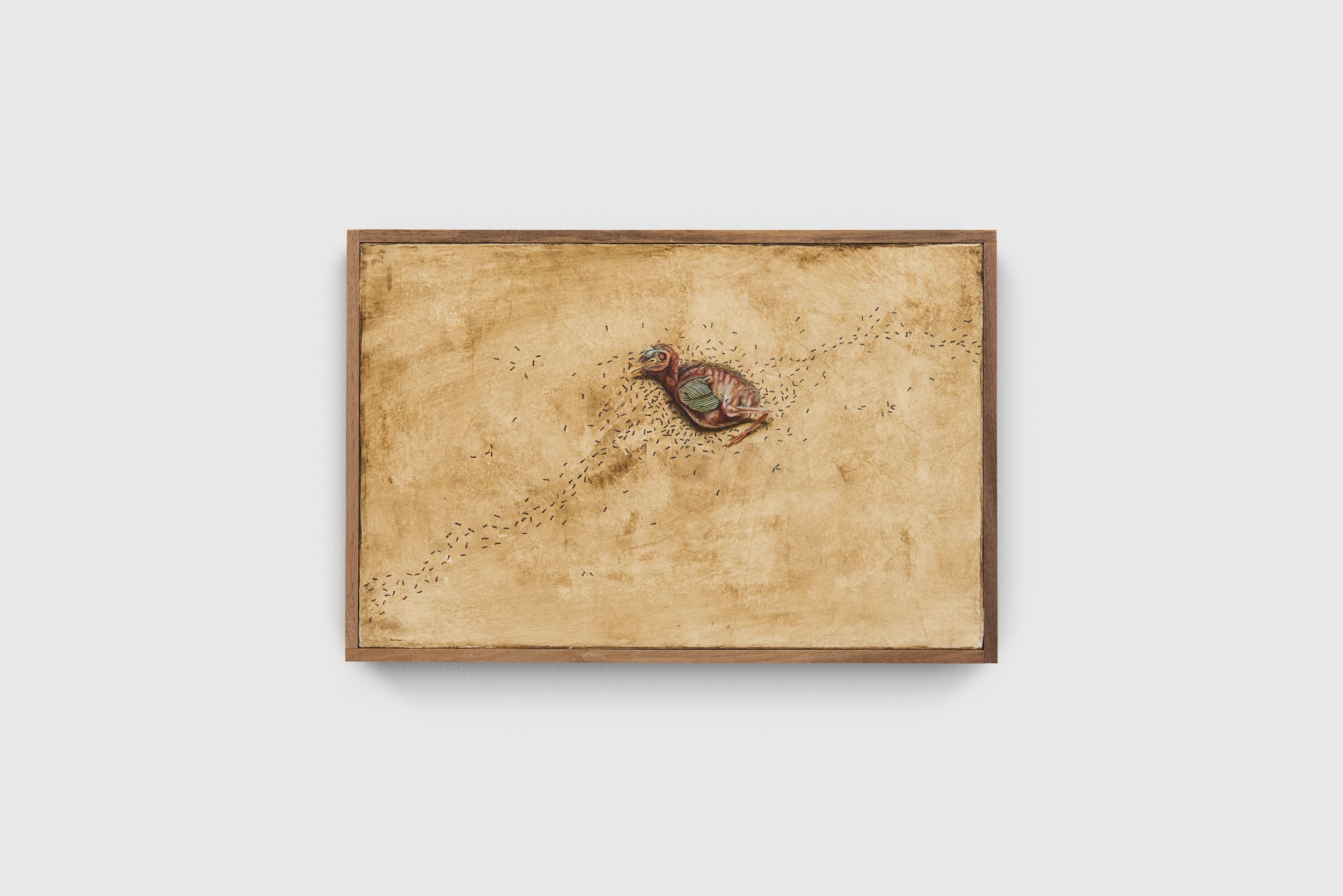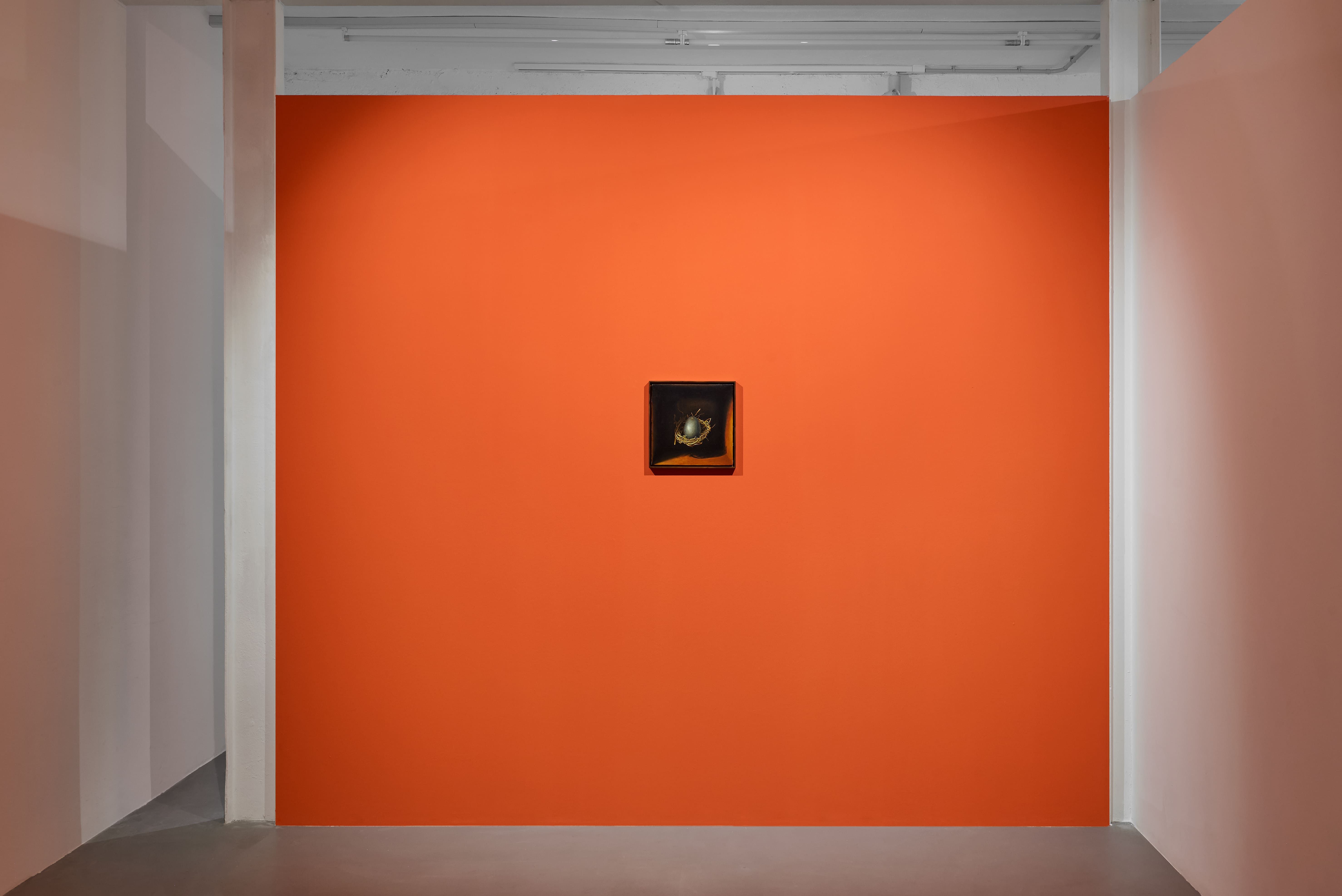 A conclusione del percorso espositivo, due piccoli e preziosi dipinti narrano del principio e della fine. Da un lato, il corpo scheletrico di un uccellino è contornato da formiche che lo attraversano. Sul fronte opposto della stanza, un uovo nel suo nido è sospeso all’interno di una nicchia. Ad accogliere l’opera una parete arancione, che contribuisce a creare un’atmosfera raccolta. «La scelta cromatica è un potenziatore visivo, il soggetto è il lavoro. Il tono scelto richiama le terre trovate in Sardegna», ha affermato l’artista.