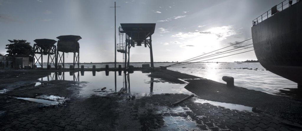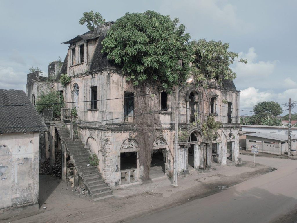 «L’interesse di Raffaela Mariniello sulla contaminazione tra il paesaggio naturale e quello urbano attraverso il passaggio dell’uomo ha trovato nella città portuale di Abidjan un terreno molto fertile che ha condotto dopo circa venti giorni di residenza ad una mostra fotografica accompagnata dalla proiezione del materiale di back stage. Le parole chiave del titolo trovano riscontro nelle immagini del Parco Nazionale di Banco, immensa area verde di foresta pluviale proprio in città, nell’imponente porto che ingombra gran parte della laguna cittadina, e in uno dei più affascinati palazzi dell’antica capitale ivoriana Grand Bassam – abbandonata negli anni 20 per un’epidemia ed oggi patrimonio dell’Unesco – in cui la natura si è appropriata silenziosamente di ciò che resta delle antiche architetture coloniali.