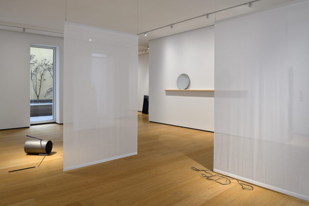 Un mondo tutto all’aperto si configura come un dialogo continuo tra i due artisti e si sviluppa tra il piano terra e il primo piano della galleria, dove sculture e installazioni si incontrano in un equilibrio fatto di vicinanze, differenze e silenzi condivisi. Il visitatore è accolto in un ambiente sospeso, in cui linee leggere e trasparenti dialogano con materiali più densi e trattenuti, come il piombo, dando vita a una danza sottile tra materia e leggerezza impalpabile. Tende che separano senza mai chiudere lasciano intravedere le opere e gli spazi, suggerendo un attraversamento lento, a concedersi il tempo necessario alla contemplazione. Le opere sono lì, immobili, presenti, si possono quasi toccare. A tratti emergono delle scritte, che non si offrono immediatamente allo sguardo ma chiedono di essere cercate, rincorse, come in un gioco. È un invito a non guardare solo davanti a sé, ma a sollevare lo sguardo, ad allargare il campo visivo, a guardarsi attorno e oltre il proprio orizzonte immediato, per aprirsi all’esperienza e lasciare entrare il significato delle opere senza pregiudizio.