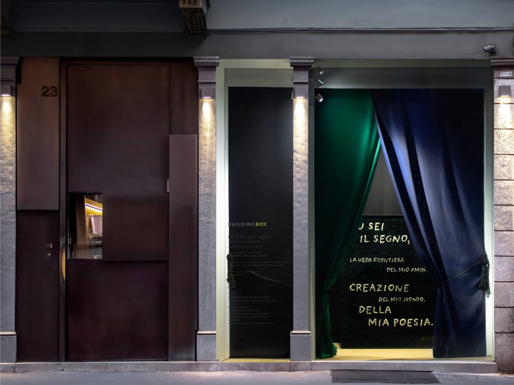 Dodici artisti in dodici mesi, così si presenta il progetto espositivo ospitato nella vetrina di BUILDING BOX, Per filo e per segno. Percorsi di arte tessile in Italia, a cura di Alberto Fiz. Dodici artisti italiani di generazioni diverse, accomunati dall’uso del tessile come linguaggio espressivo centrale della contemporaneità. Negli ultimi anni il tessuto ha ritrovato una nuova vitalità, affermandosi come pratica capace di restituire attenzione alla materia, al corpo e al gesto in un’epoca segnata dalla smaterializzazione digitale. Arazzi, installazioni e interventi site-specific si alternano lungo lo spazio di via Monte di Pietà, visibili 24 ore su 24, componendo una trama di fibre, nodi e intrecci. Apre il programma l’installazione Frontiera del mio amore (2025) di Numero Cromatico, collettivo artistico e centro di ricerca multidisciplinare che dal 15 gennaio all’11 febbraio 2026 presenta l’opera realizzata per l’occasione: un arazzo che riporta “Tu sei il segno, la vera frontiera del mio amore. Creazione del mio mondo, della mia poesia”, tratta dall’antologia I.L.Y., I Love You, generata con il supporto di un’intelligenza artificiale istruita dal collettivo sul tema dell’amore. La poesia prende forma nell’incontro tra il linguaggio automatico e il gesto lento della tessitura. Passando davanti alla vetrina, qualcosa trattiene lo sguardo, parole affiorano di sfuggita, colte con la coda dell’occhio, abbastanza da fermarsi, tornare indietro, leggere. Dietro le tende, stese come un sipario, l’installazione si lascia intravedere. È un richiamo, un invito a sospendere il passo, a restare per un momento con sé, prima di rientrare nella corsa quotidiana, nelle proprie domande. Dal 13 febbraio all’11 marzo segue Paola Anziché con Imparando dalle forme (2019–2025) che trasforma il tessile in esperienza intima e sensoriale. Chiude il ciclo, dal 13 marzo all’8 aprile 2026, Maurizio Donzelli con un nuovo lavoro in tessuto jacquard ispirato agli Arazzi dei Mesi di Bramantino, in cui l’immagine si frammenta e si rende ambigua.