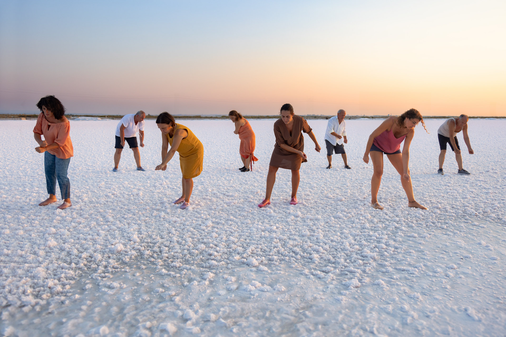 BUILDING TERZO PIANO, fino al 14 febbraio 2026, esporrà La danza del sale, mostra personale di Virginia Zanetti, a cura di Giulia Bortoluzzi. All’interno dello spazio, il percorso si sviluppa tra elementi naturali, blocchi di sale e strumenti di lavoro delle saline riprodotti in vetro, opere scultoree nate dall’esperienza dell’intervento site-specific e delle performance collettive realizzate nella salina di Margherita di Savoia (BT). Presenze leggere che conservano la memoria stessa del sale. Alle pareti fotografie che mostrano gesti rituali, corpi di lavoratori avvolti in abiti dai colori intensi, in netto contrasto con il bianco accecante della materia. Un video accompagna questo attraversamento, documentando la performance La danza del sale (2023), realizzata in collaborazione con la coreografa e danzatrice Ma^ Teta Lonigro, il saliniere Raffaele Valerio e alcuni abitanti della comunità locale. I movimenti del lavoro quotidiano vengono riprodotti dai corpi, ormai privati degli strumenti e della funzione produttiva. Al centro del progetto c’è il tema dell’impermanenza, il passaggio da uno stato all’altro, la trasformazione continua della materia e delle relazioni che la attraversano. I gesti, si ripetono, si trasformano, e danno vita a un rito condiviso in cui il lavoro diventa danza e memoria.