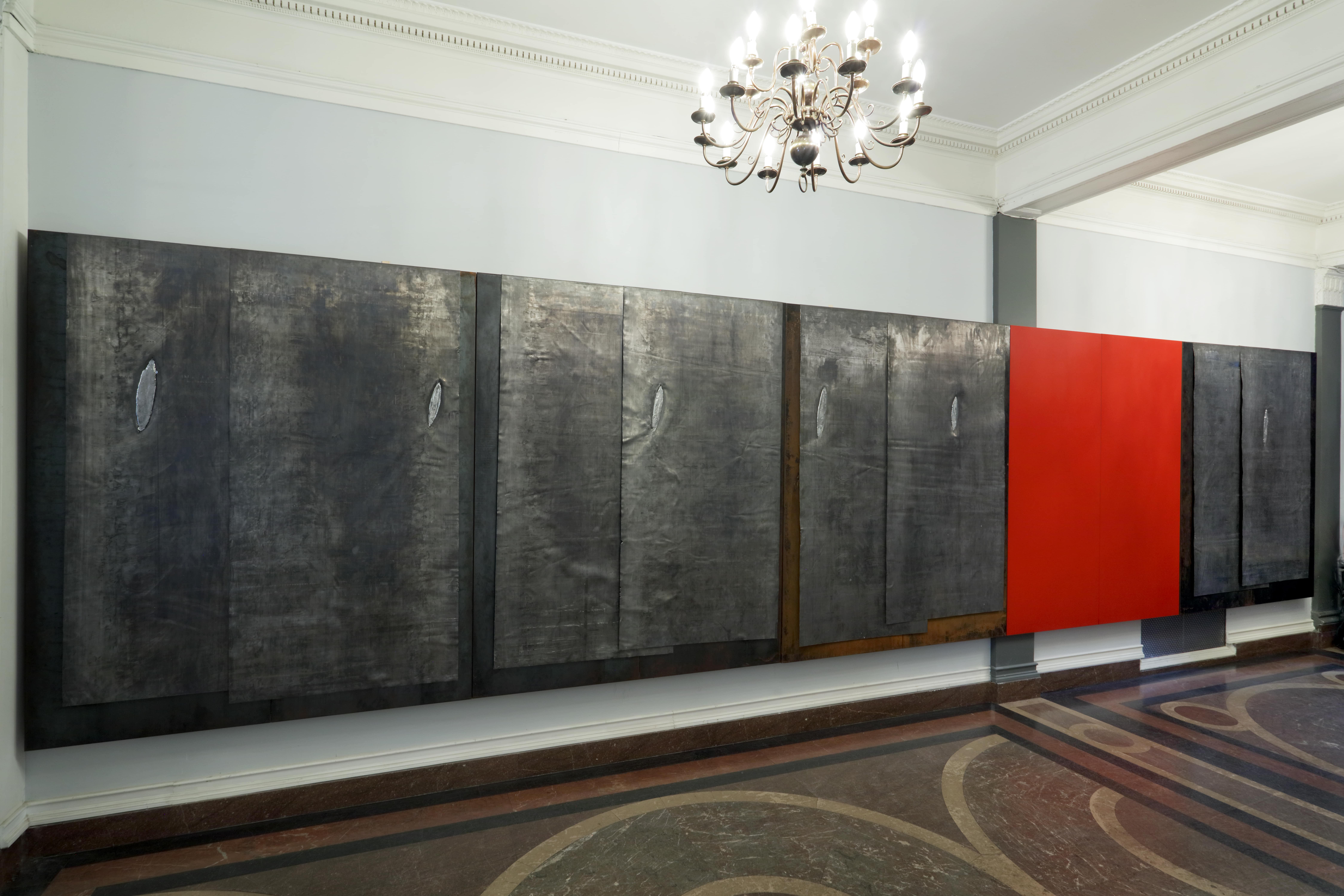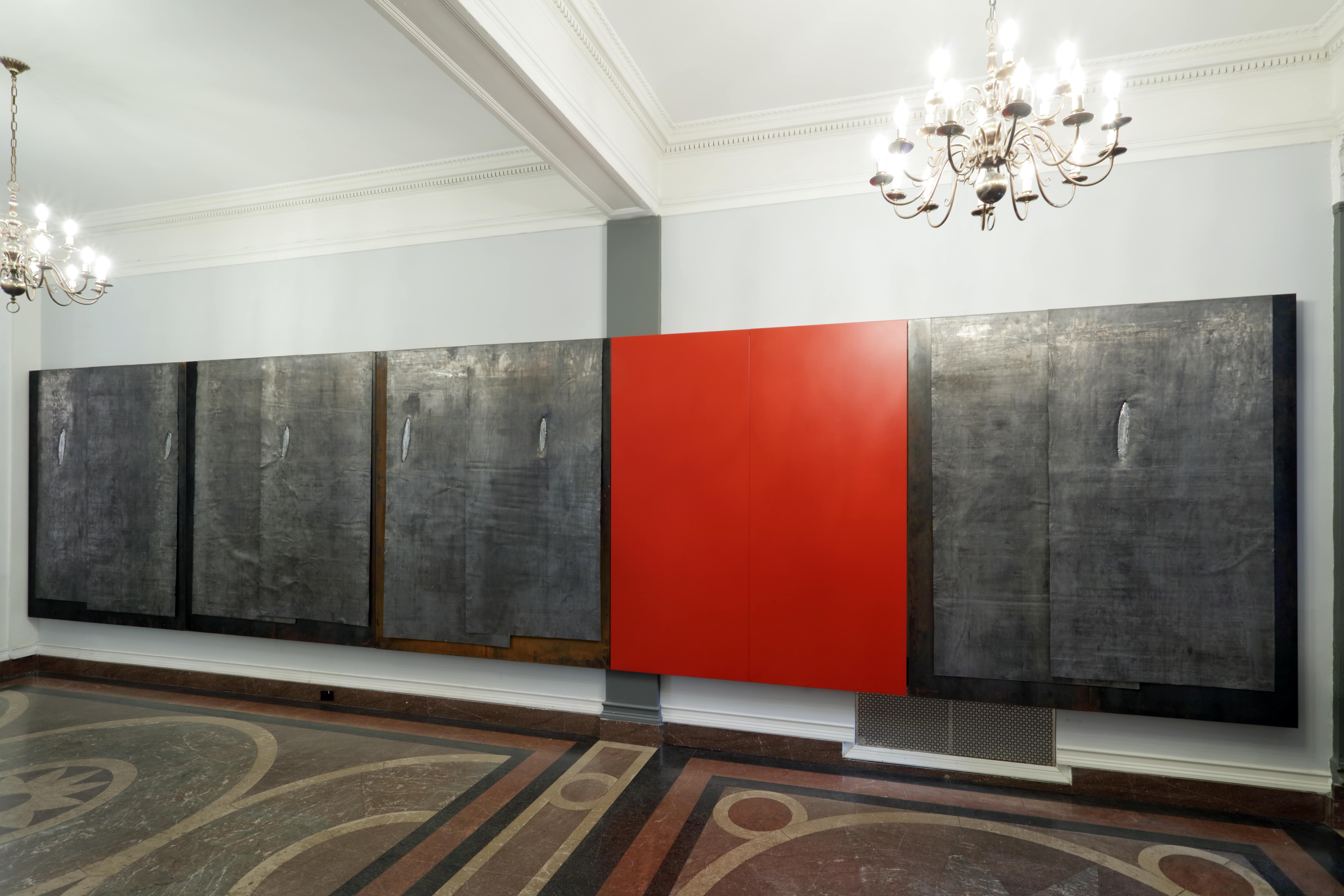 Jannis Kounellis è presente con Senza titolo (Omaggio a Fontana) (1986), un’installazione imponente composta da cinque pannelli d’acciaio – quattro rivestiti in piombo, uno smaltato di un rosso vibrante – che creano una tensione visiva e concettuale a evocare il rapporto tra passato e presente, tra incisione e superficie, tra peso e leggerezza. Il riferimento a Lucio Fontana vuole rappresentare un’estensione del concetto di taglio come apertura spaziale e temporale.
