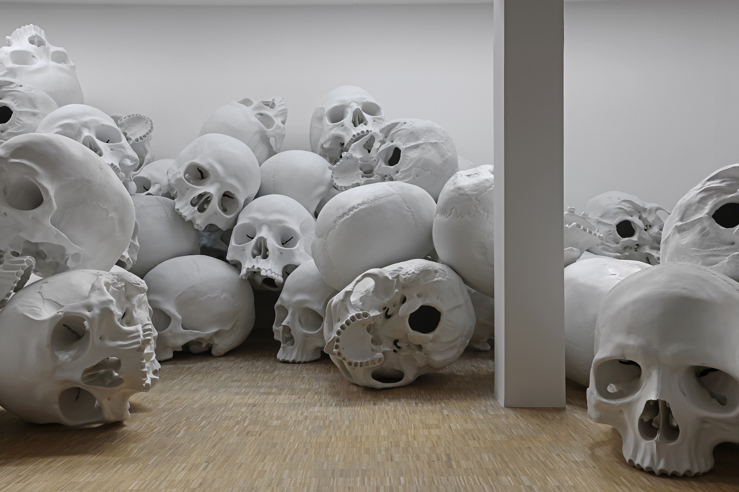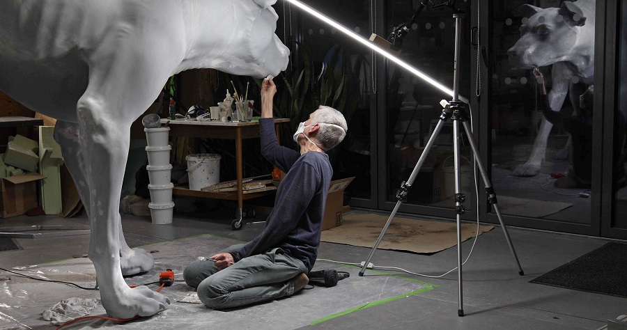 In 25 anni di attività, Mueck ha realizzato 48 opere in totale, la più recente delle quali è stata completata poco prima dell’inaugurazione della mostra alla Fondation Cartier pour l’art contemporain a Parigi, nel mese di giugno 2023. Per ognuna è stato necessario un lavoro lungo e meticoloso, portato avanti per mesi o anche per anni, condotto parimenti sui materiali e sui concetti, per riuscire a trasmettere precisamente quella sensazione di spaesamento che si prova quando si è al cospetto di qualcosa che è lì davanti a noi ma che allo stesso tempo è fuori posto e che, come se non bastasse, spesso ricambia lo sguardo, con sospetto, con curiosità, con ferocia. A farci entrare in questo complesso processo mentale ma anche metodologico, che precede la nascita dell’opera, sono due, film Still Life: Ron Mueck at Work (2013) e Three Dogs, a Pig and a Crow (2023) che, a distanza di dieci anni l’uno dall’altro, hanno aperto e riaperto le porte dello studio londinese di Mueck.