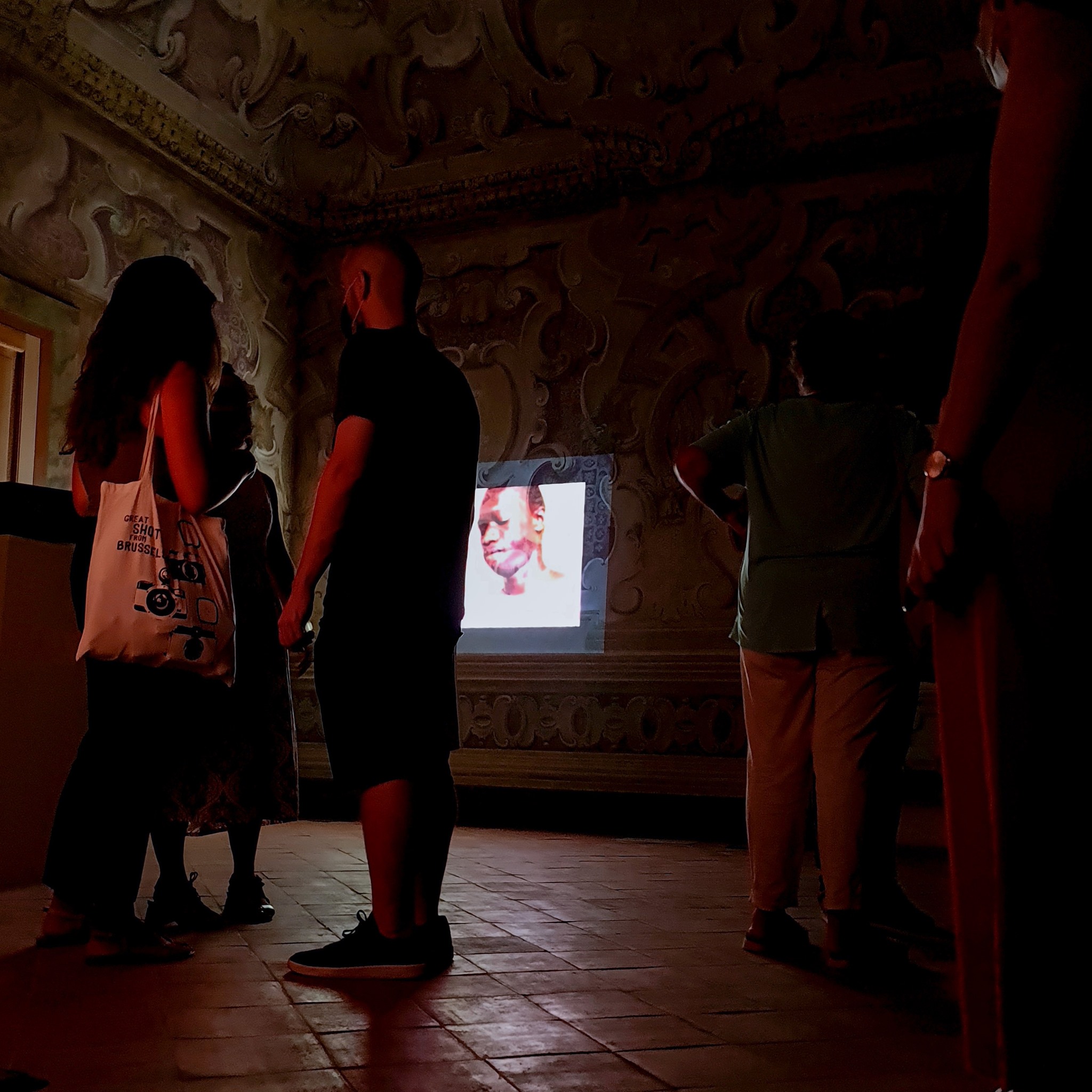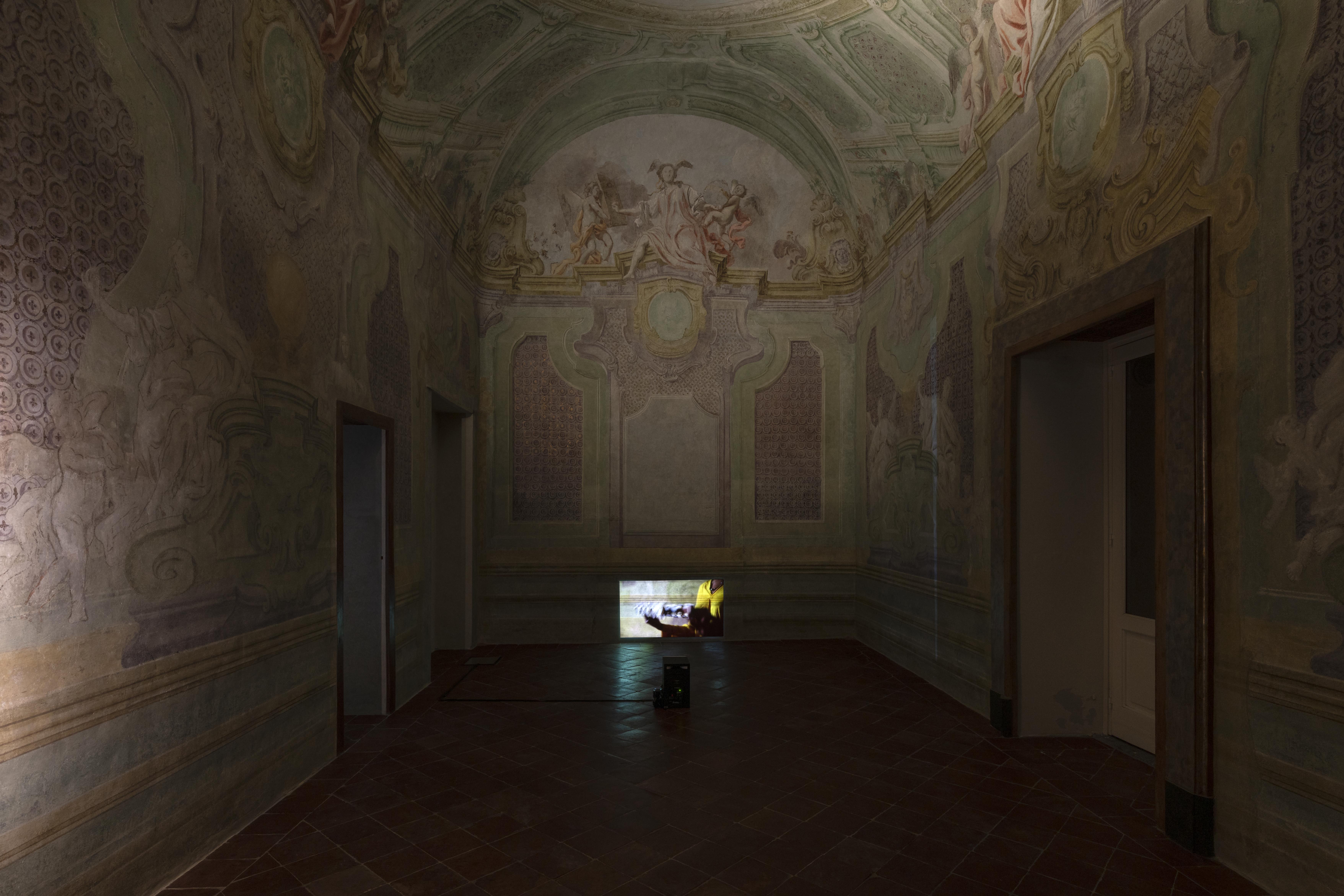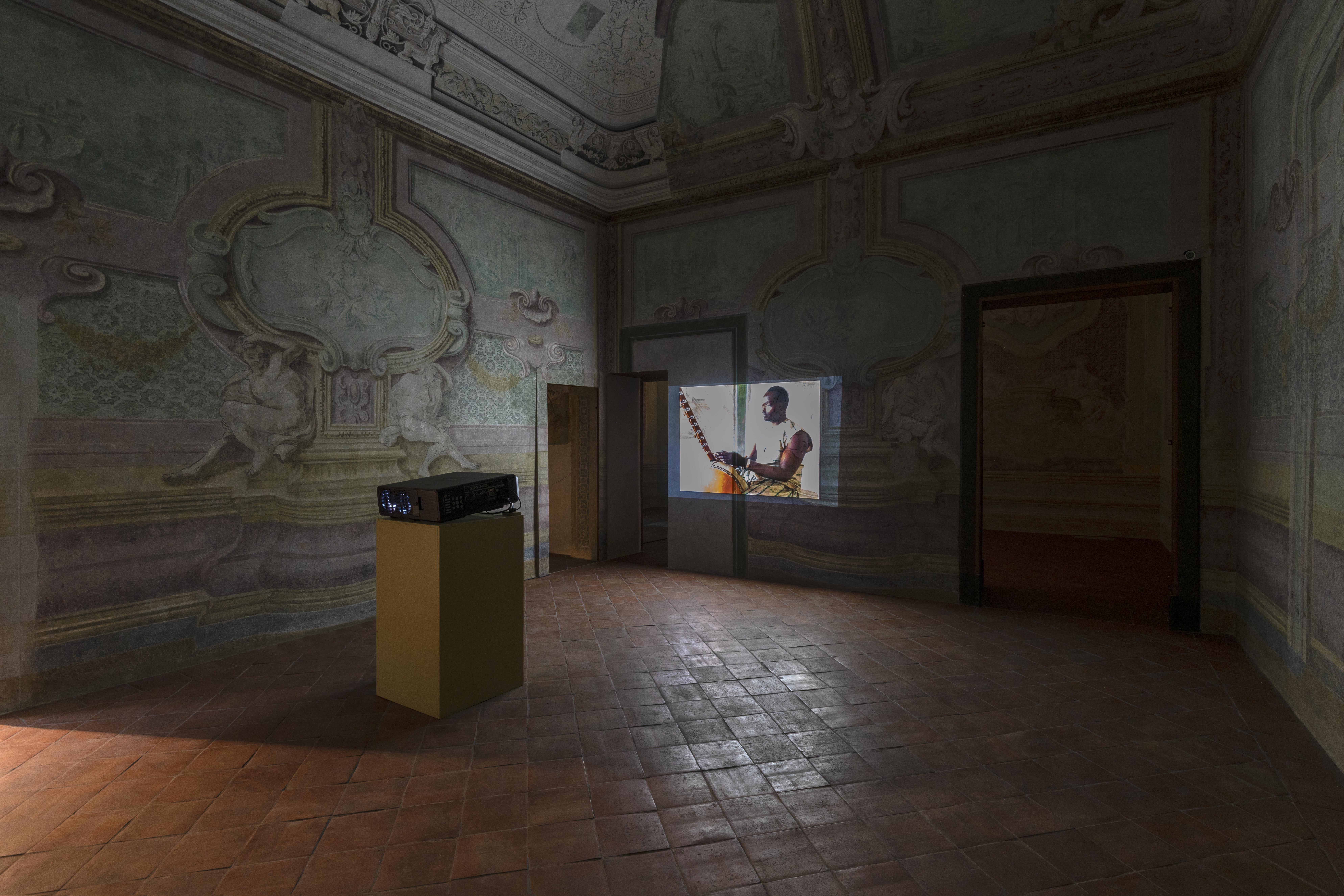 La successione delle sale affrescate al primo piano è scandita da una serie di video a inquadratura fissa, in cui musicisti e musiciste performano il loro strumento, ampliando il gesto del suonare con l’eredità delle loro storie di migranti o abitanti, di corpi e di storie provenienti da una parte del mondo e dall’altra. Voci, forme e materiali diversi eppure espressi intorno a un linguaggio sempre comprensibile, piacevole da fruire perché percorso dalla freschezza uditiva ma anche visiva del nuovo, dell’inatteso, come le angolazioni diverse e le diverse altezze scelte per le proiezioni, una per sala e tutte in dialogo tra loro.