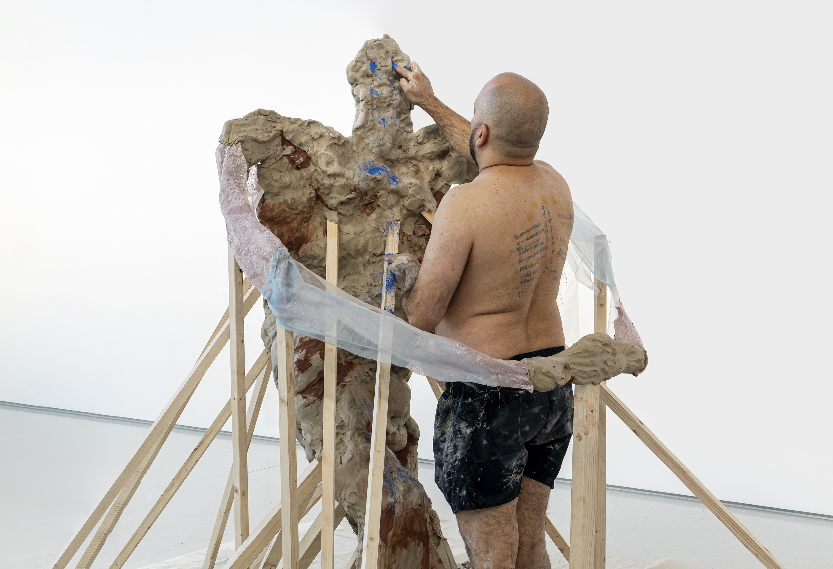 “Non sarà sudore oggi, sulla sua pelle, sarà terra, argilla, colore, materia. Intorno a lui, addosso a lui, come il vuoto che ha raggiunto il suo culmine, cristallizzandosi in un abbraccio che lo (trat)tiene e lo colma, esaurendosi.”