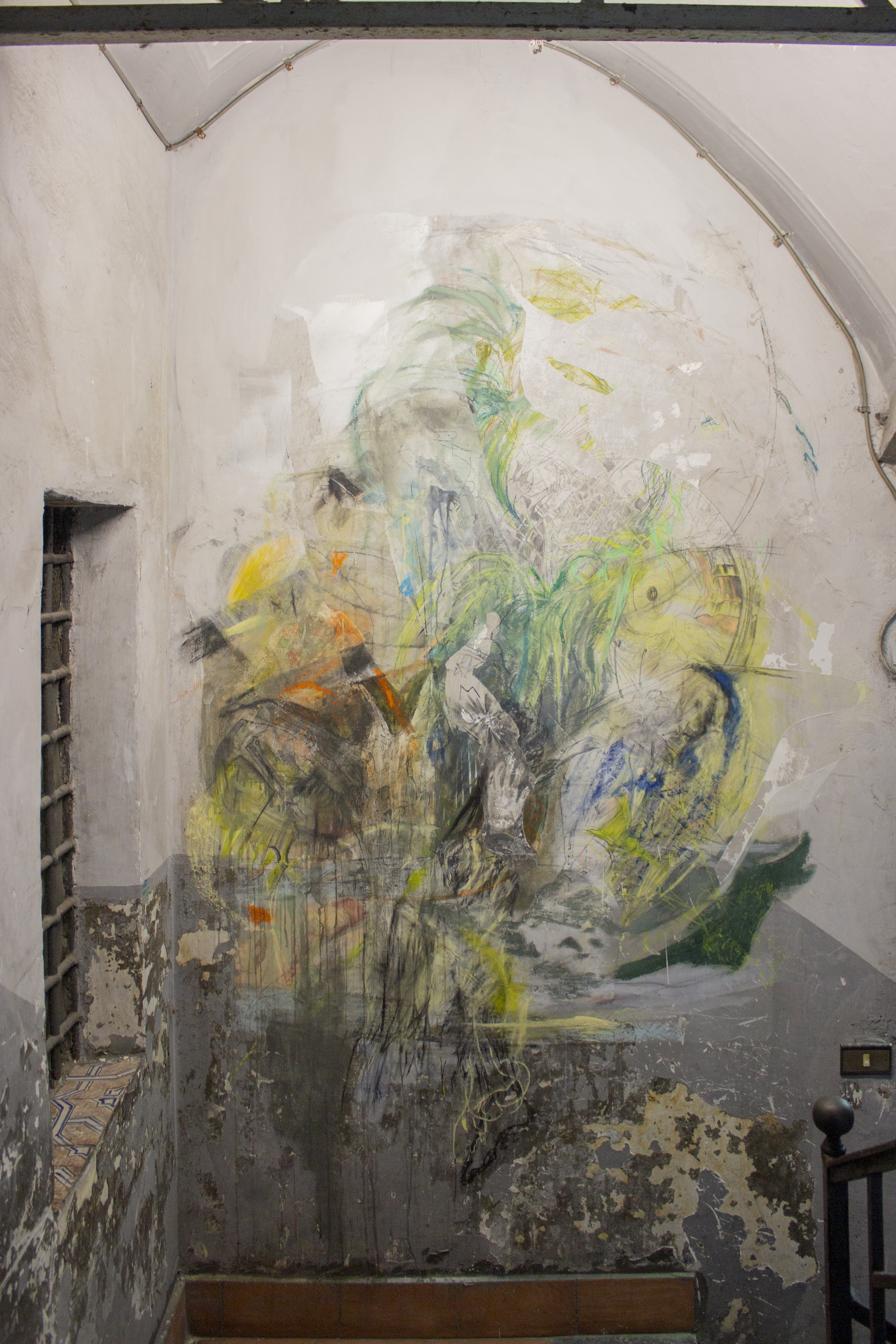 Sulla superficie del muro incuneato nella strettoia del primo interpiano, si agita un vortice di forme e di colori irradiati dal palmo di una mano, un saluto, un segno di intesa o attenzione, una imposizione magica o mistica, un’affermazione di presenza. Con l’energia del suo tratto, tra macchie e campiture, forme organiche e meccaniche, Andrea Bolognino ha percorso le stratificazioni della parete. Per impressione o sottrazione, una linea dopo l’altra, segno dopo segno, si scandisce il carattere ambiguo dello scorrere del tempo, un non finito latente che sfugge alla comprensione e imprime e riscrive il proprio passaggio, al di là e al di qua delle strutture di pietra, ferro e cemento.