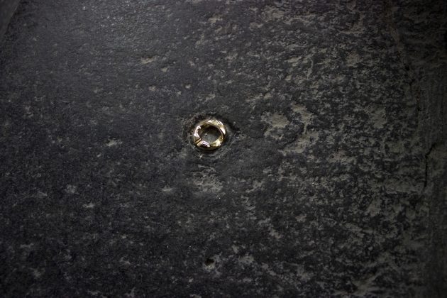 Arrivato all’ultimo piano, non c’è nessun altro, le porte degli appartamenti sono chiuse e delle voci dell’Atelier Alifuoco arriva solo qualche vocale un po’ più acuta. In questo orizzonte di sospensione, l’opera di Lucas Memmola è un cenno che si intravede tra le piante, ci vuole qualche secondo per rendersene conto ma poi quel disco di riverberi bruniti – sovraimpressi sul muro oppure emergenti “dall’altra parte” come per un fenomeno di capillarità – cattura l’attenzione, la intriga, come oro antico da riscoprire, come una maschera di Agamennone in cui chiaroscuri creano zone di vuoto e forme vaghe.