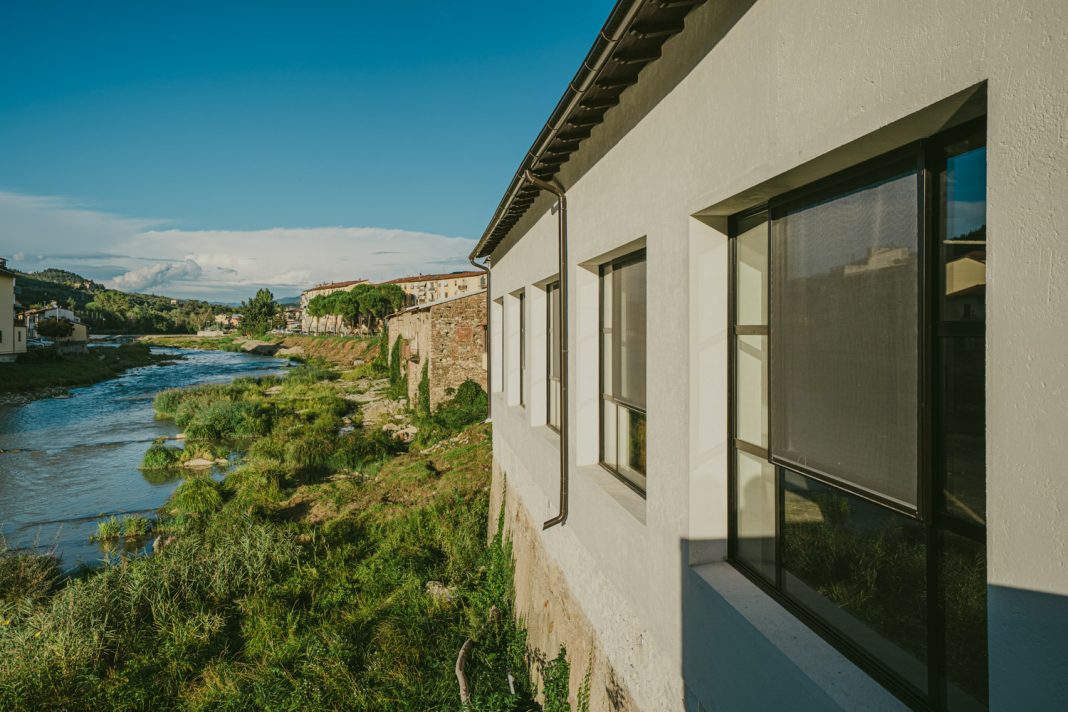 La sede contribuisce in modo decisivo a definire l’identità del progetto. Il centro sorge infatti in un articolato complesso industriale di via del Molino, nei pressi del Ponte Mediceo del 1541, un’area che per oltre sei secoli ha ospitato mulini, gualchiere, filatoi e manifatture tessili alimentate dall’energia del fiume. Un luogo segnato dalla storia produttiva del territorio, duramente colpito durante la Seconda guerra mondiale e ricostruito nel Dopoguerra, che oggi viene riconvertito in chiave culturale senza cancellarne le stratificazioni.