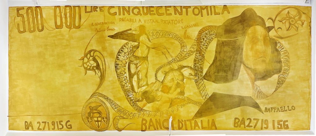 «La banconota italiana col più alto valore, le 500mila lire, è quindi rappresentata da Raffaello Sanzio, generalmente identificato come l’artista più spirituale. Il denaro, con la sua realtà concreta, inconscia, simbolica e psichica, è, oltre che lo sterco del demonio, l’angelo custode del genere umano, proprio come quello che appare nell’opera», ha continuato l’artista. «Non è la prima volta che propongo una pittura su muro di banconote, ma in ambito pubblico ho spesso avuto contrasti e censure: l’ambiguità del denaro, il fare buoni affari, come sentenziava Andy Warhol, è tanto raccomandato e desiderato, quanto, se rappresentato, evitato come ambiguo e denso di ombre. Ma è proprio questo il terreno dell’artista, che tenta di dare, anche se contrastato e censurato dagli stessi adoratori del denaro, un differente punto di vista».