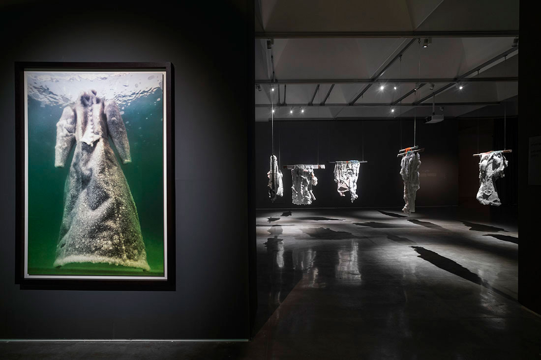 Da quella realtà naturale infatti ha tratto ispirazione per dare vita a un processo di trasformazione che fa assurgere oggetti di ogni tipo, immersi per mesi in quelle acque, a una dimensione simbolica e magica: visioni sospese nell’ambiguità evocativa fra l’eternità della pietrificazione e la caducità del ghiaccio che si scioglie per l’innalzamento della temperatura o dei sali minerali che si disfano nelle inondazioni incontrollabili.