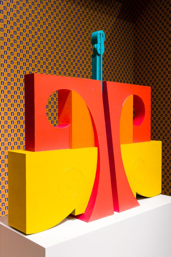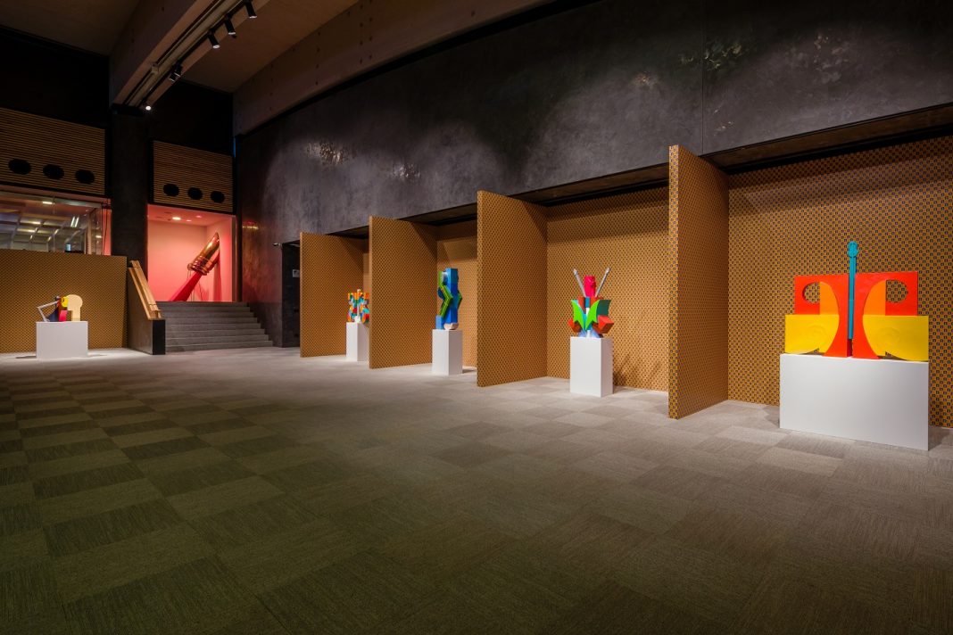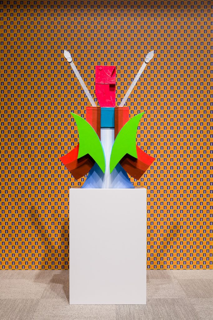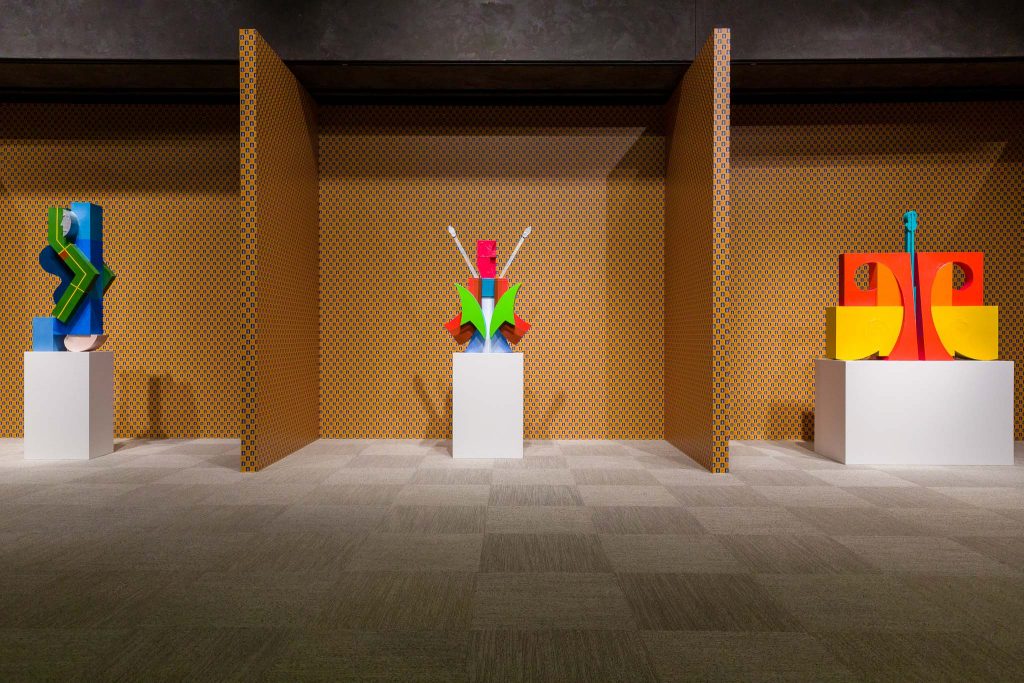 Otto sculture sullo sfondo di una carta da parati optical, sovvertendo i colori del francobollo postale del 1924 con il cane e lo spiritello iconico di Campari, che secondo Bonacossa, «Disturba il tuo guardare, ma immette anche le sculture in un mondo pop, come fossero degli oggetti d’uso». I loro riferimenti, le idee e immagini provengono da molti luoghi e contesti. Dalla storia della scultura mesoamericana, al modernismo.