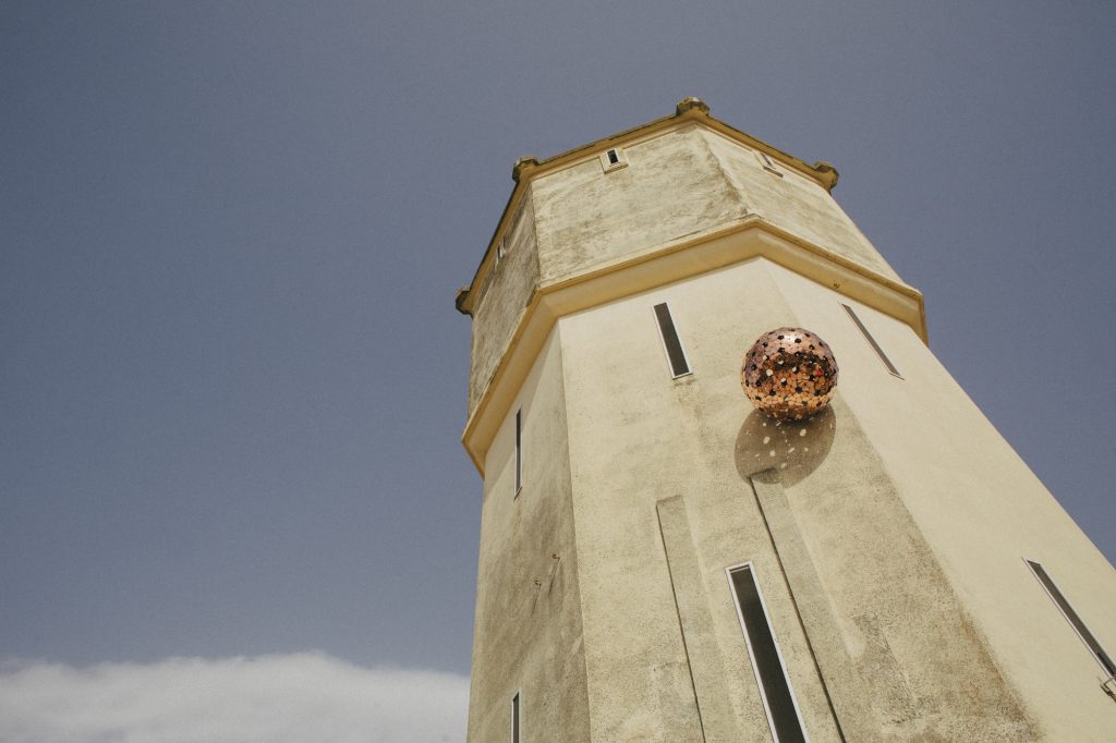 È la distanza tra corpi a segnare la riflessione di Marullo; “afèlio”, come indica la sua etimologia dal greco antico ἀπό «lontano da» e ἥ λιος «sole», è infatti il punto orbitale più lontano che un corpo celeste raggiunge rispetto alla stella madre del sistema solare: il Sole. La definizione che nasce con Keplero, sollecita Marullo ad aprire una riflessione sulla condizione tra corpi in un sistema di dipendenza da un altro centrale, per ripensare sia al loro posizionamento sia ad una visione di insieme tra soggetti e oggetti. È la relazione tra binomi io/altro, centro/periferia a rovesciarsi attraverso la materia delle opere realizzate e attraverso l’esperienza innescata nello spazio che le ospita. L’opera principale è “Lorica”, un astro in maglia di rame che, deviando dalla sua orbita spaziale e incastratosi sulla torretta dell’acquedotto del paese, non solo interagisce con l’ambiente circostante, ma anche con il cosmo stesso. Ogni giorno infatti, in accordo con il Sole, proietta la sua ombra sull’edificio e fungendo da meridiana evidenzia il trascorrere del tempo. Inoltre, sottoposta a un processo di naturale ossidazione, l’opera continuerà a trasformarsi nel tempo, segnando la sua inesorabile relazione con gli agenti atmosferici.