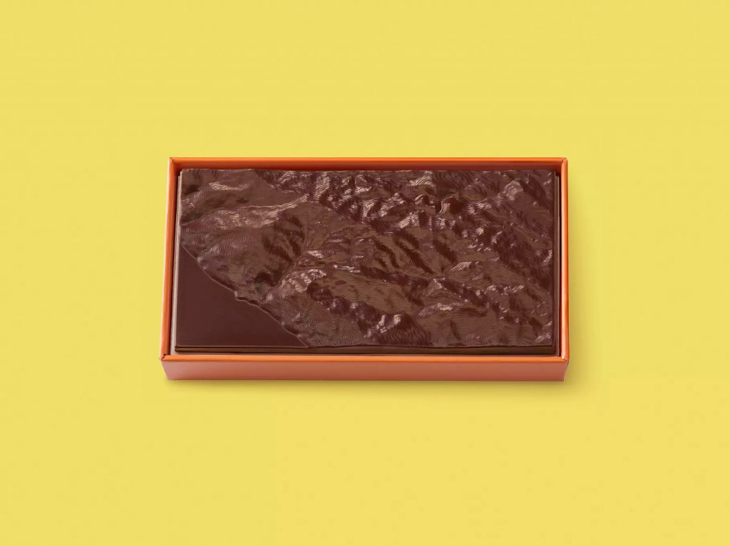 Il linguaggio artistico di Ed Ruscha ma impresso su una tavoletta di cioccolato fondente: cosa c’è di più pop? Sembra un sogno ma è realtà: un preziosisissimo dolcetto nato dalla collaborazione tra Ruscha e andSons Chocolatiers. Il risultato, a metà tra l’oggetto di consumo e l’opera d’arte, è una tavoletta di cioccolato fondente modellata come una sezione topografica della Central Valley californiana, nel punto di contatto tra le Santa Lucia Mountains e l’Oceano Pacifico.