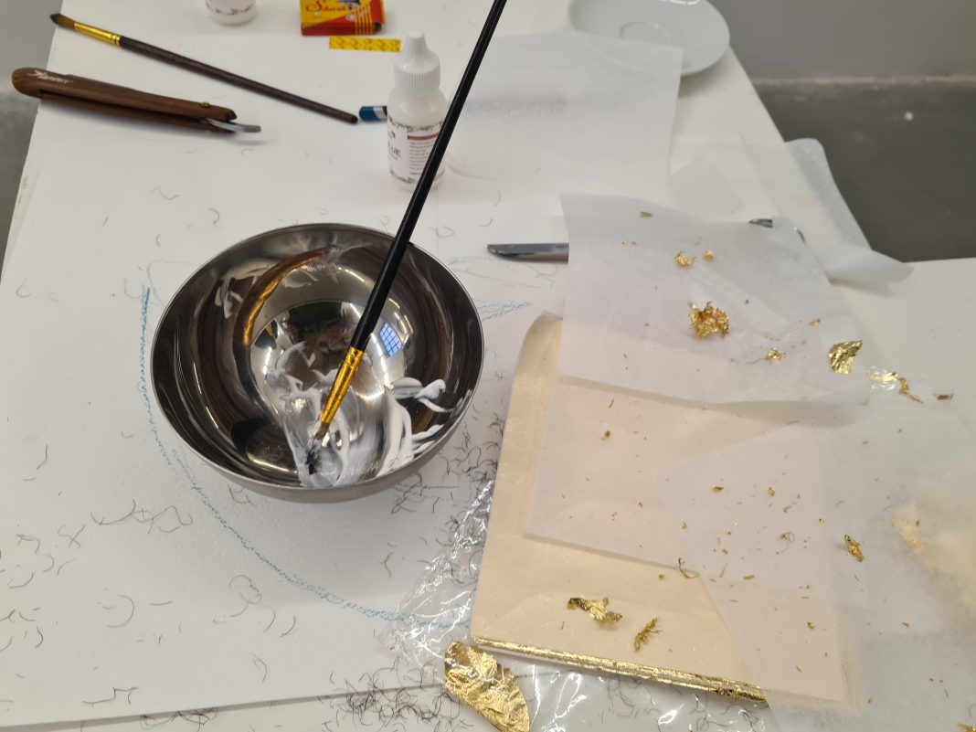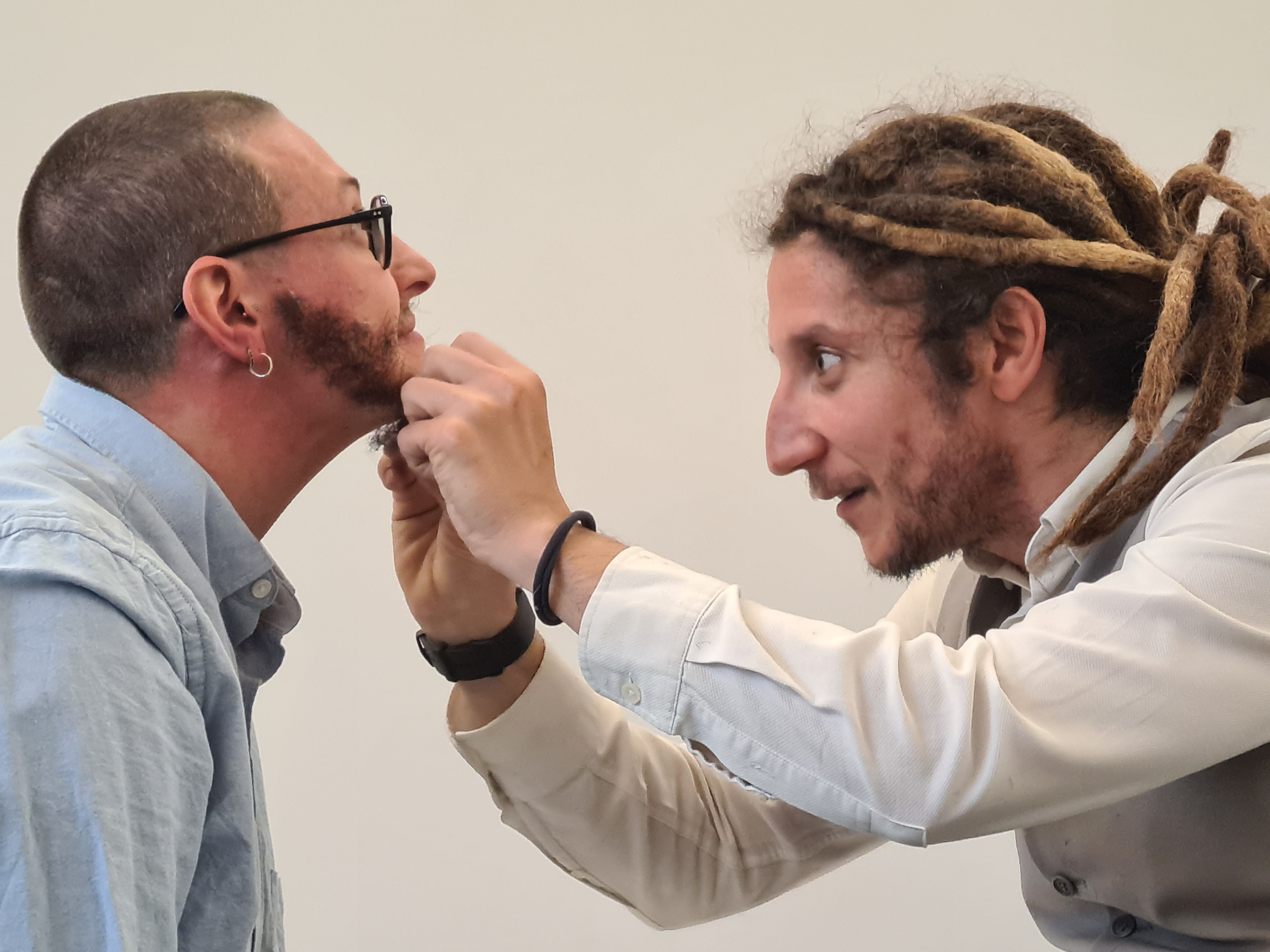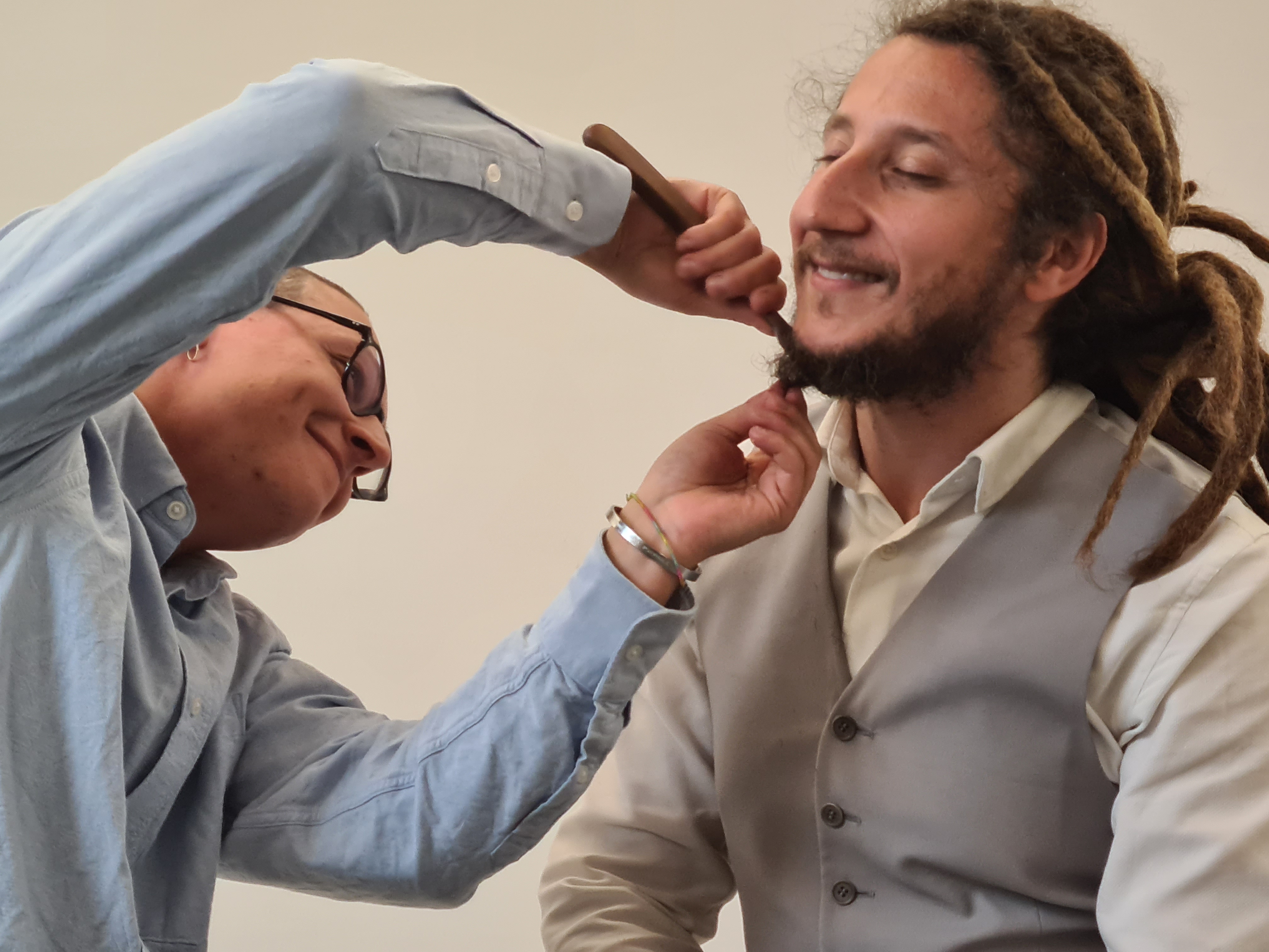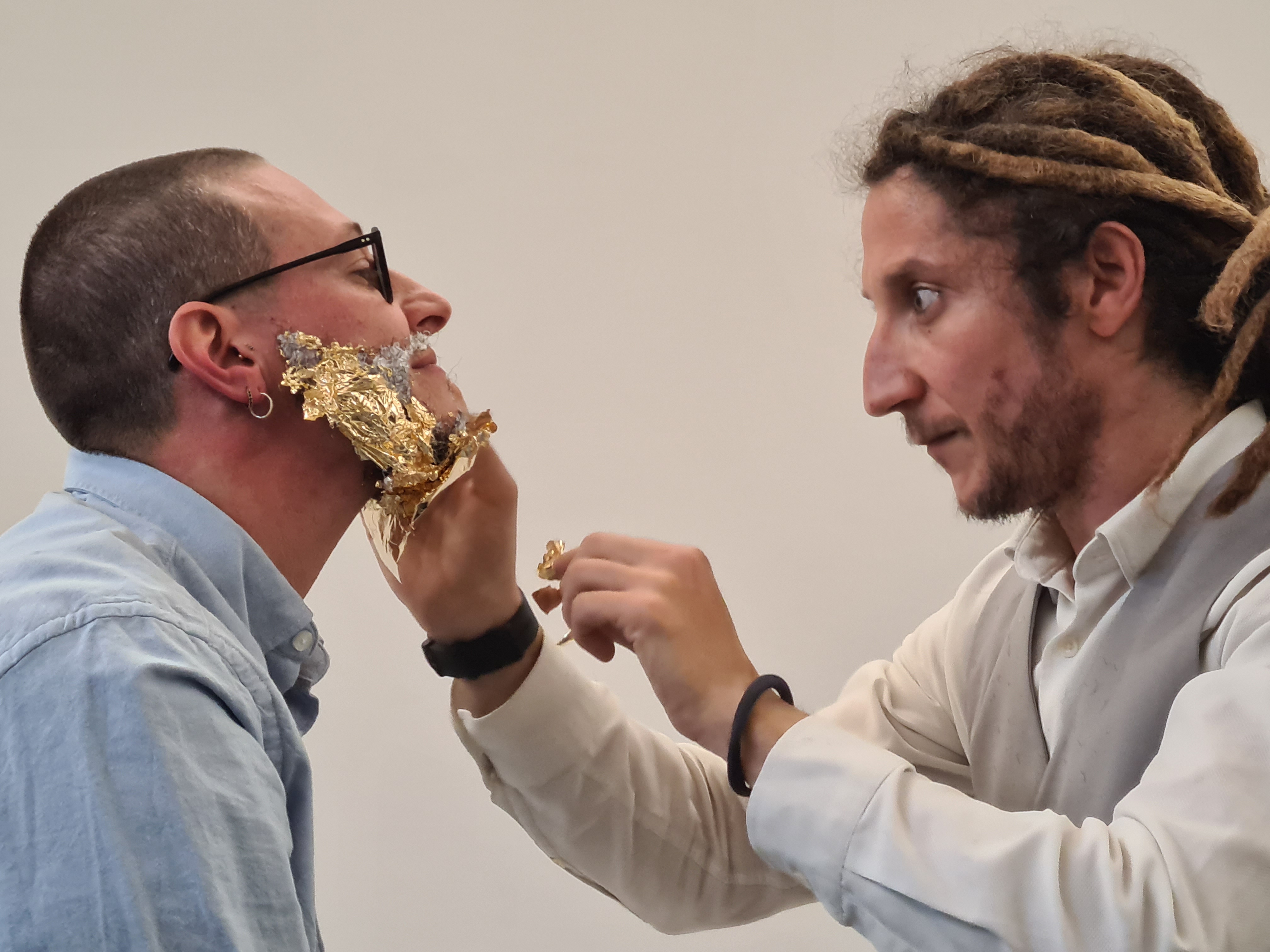 Filippo traccia su di un foglio bianco il disegno della sua barba, unico modo di tracciare delle coordinate per la voluta assenza di uno specchio. Francesco prende un rasoio a mano libera, lo carica di una lametta, inizia a tagliare la barba di Filippo e pone i peli nei corrispondenti tratti disegnati sul foglio. Finita la rasatura, Filippo prende i relativi peli e li fissa sul volto imberbe di Francesco. Che, alla fine, impreziosisce con della foglia d’oro. E l’emozione di Francesco è ormai tangibile. Nel continuo contatto visivo, accompagnato anche da impercettibili bisbigli, i due si stringono le mani, si ringraziano a vicenda, si alzano e si allontanano dalla scena. Un diverso brano musicale accompagna l’uscita dei due protagonisti.