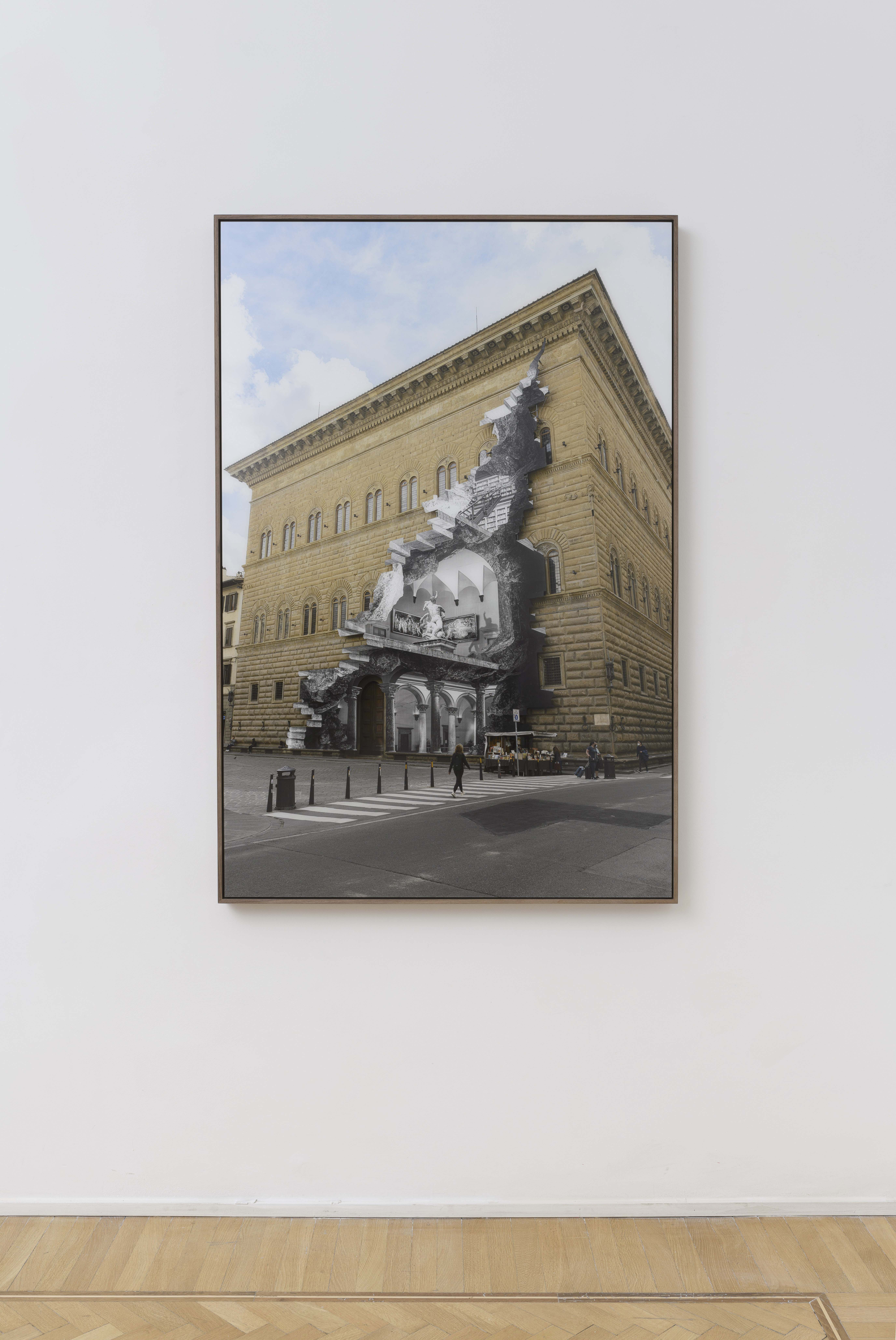 Le installazioni monumentali d’arte pubblica rappresentano, quindi, solo una parte del suo lavoro, opere effimere la cui unica traccia – come è lo stesso JR a sottolineare precisando che si tratta di progetti autofinanziati, come quelli che facevano Christo e Jeanne-Claude, in cui non c’è uno sponsor commerciale – è nelle opere che li documentano e di cui i collezionisti diventano “Guardiani”. Creando il passaggio, la breccia, l’apertura nella struttura architettonica dell’edificio – Palazzo Strozzi durante la pandemia di Covid-19 era chiuso al pubblico, mentre l’accesso a Palazzo Farnese, sede dell’Ambasciata di Francia, è solitamente off-limits per i visitatori tranne in occasione di eventi annuali – JR parte dalla storia stessa dell’edificio, lo studia strato per strato e lo restituisce alla collettività sollecitando un sentimento di eterno stupore.