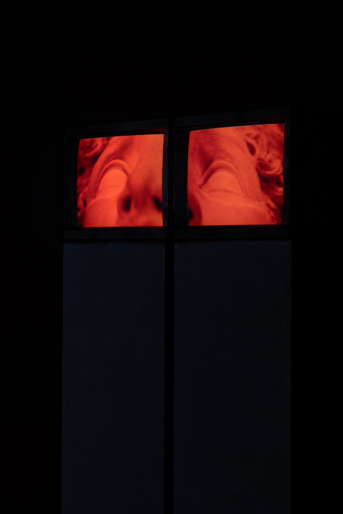 In mostra l’opera Eclissi, due occhi di pietra che scrutano lo spettatore, come guardiani silenziosi. In linea con la sua ricerca sul rapporto fra luce e oscurità, fra chi osserva e chi è osservato, fra preda e predatore, l’artista ha filmato gli occhi della Medusa di Canova – oggi conservata alla Gypsotheca di Possagno – attraverso un filtro ottico rosso. Questa tonalità di rosso, impiegata in alcuni dispositivi per la visione notturna, facilita l’adattamento dell’occhio umano ai bruschi cambiamenti di luminosità, permettendo un passaggio repentino dal buio alla luce, e dalla luce all’oscurità.
