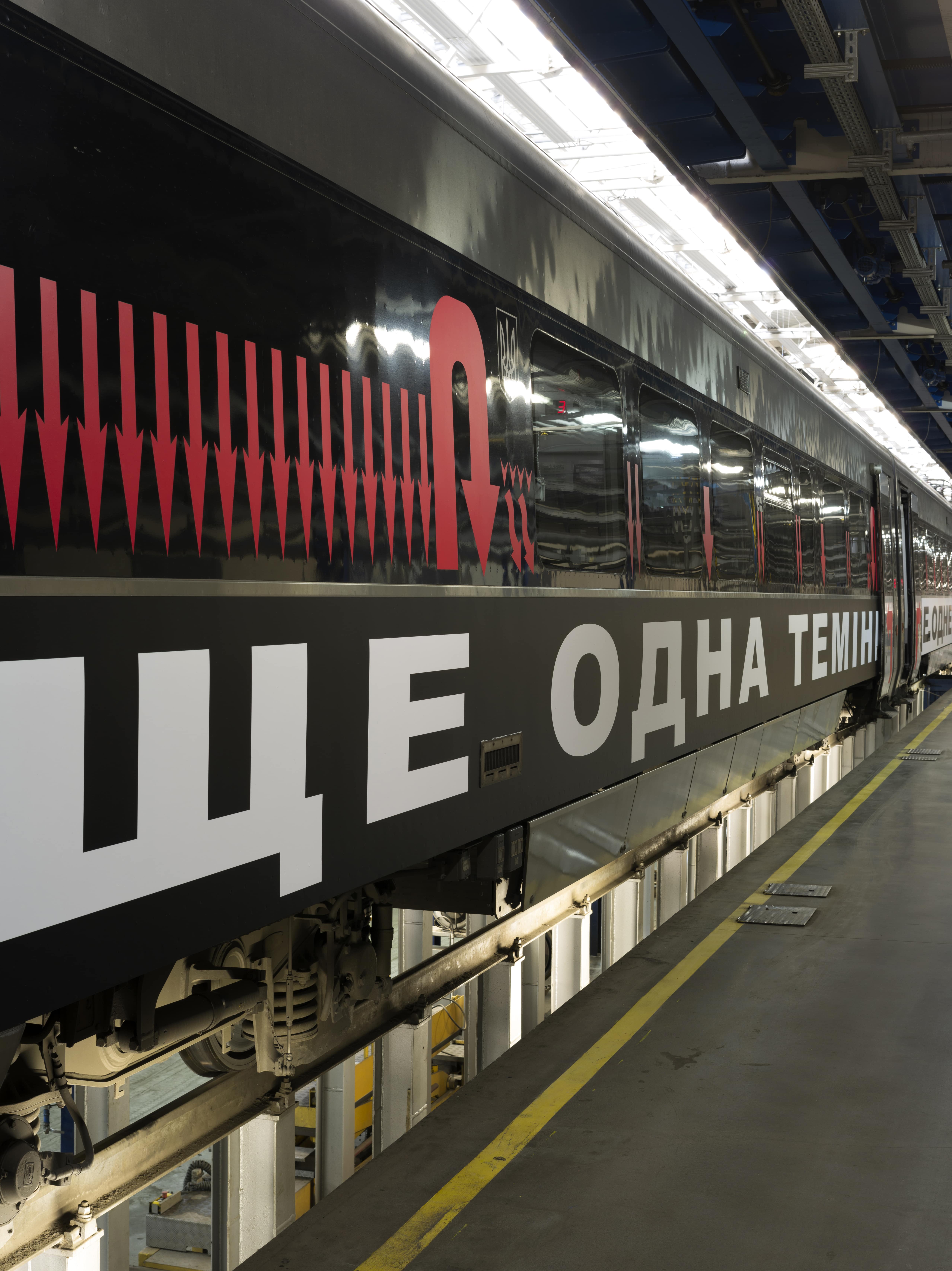 Il testo, stampato in grande formato e tradotto in ucraino, si dispiega come un poema visivo sulla scocca del convoglio, scandendo un ritmo martellante fatto di coppie binarie: «ANOTHER DAY / ANOTHER NIGHT / ANOTHER DARKNESS / ANOTHER LIGHT…». Una liturgia di contrasti che ricalca il battito regolare del treno e che riflette, nelle sue alternanze serrate, le oscillazioni di una nazione in guerra. Il progetto è curato da Maria Isserlis, storica dell’arte e curatrice ucraina attiva a Dresda, e sostenuto da RIBBON International, piattaforma no-profit dedicata alla promozione della cultura artistica ucraina in patria e all’estero, in collaborazione con Ukrzaliznytsia (Ferrovie ucraine).