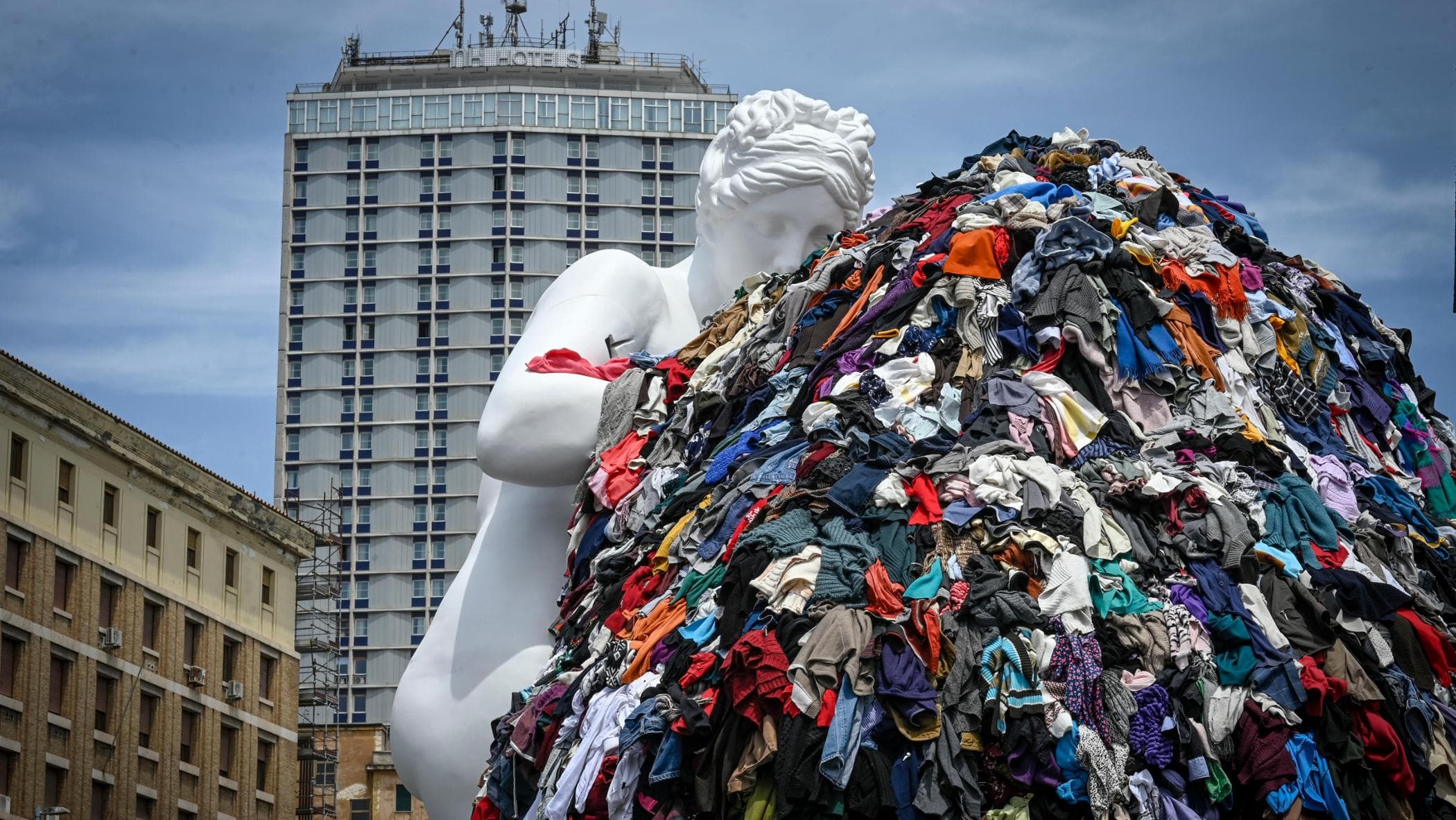 C’è un sole che spacca le pietre e il braccio meccanico che porta gli operai in alto dondola e si distende con lentezza. Una piccola tenda è posizionata ai lati dello spazio recintato da una rete metallica, come ricovero per i lavoratori. È come un qualsiasi cantiere, temporaneo, in una città assolata e caotica. La differenza è che non ci sono rumori di martelli pneumatici o di escavatrici. Pure qualche passante si ferma, fa le foto. Non ci sono umarell, non ancora almeno. Solo qualche turista, per ora. «Giornalista?». Cerco di confondermi ma le mie domande sono state troppo mirate, invadenti perfino. Chiedo qualche informazione, le risposte del capocantiere sono nette, precise, accento del nord. Sono “stracci” dal macero di Torino. Magliette, pantaloni, giubbini, coperte, jeans, vecchi abiti abbandonati da qualcuno, in qualche luogo imprecisato del Nord Italia. Nessuno di loro avrebbe immaginato che quei “panni”, come li chiamano affettuosamente a Napoli, abbandonati, sarebbero diventati pezzi d’arte. Che avrebbero avuto una nuova vita in una città lontana.