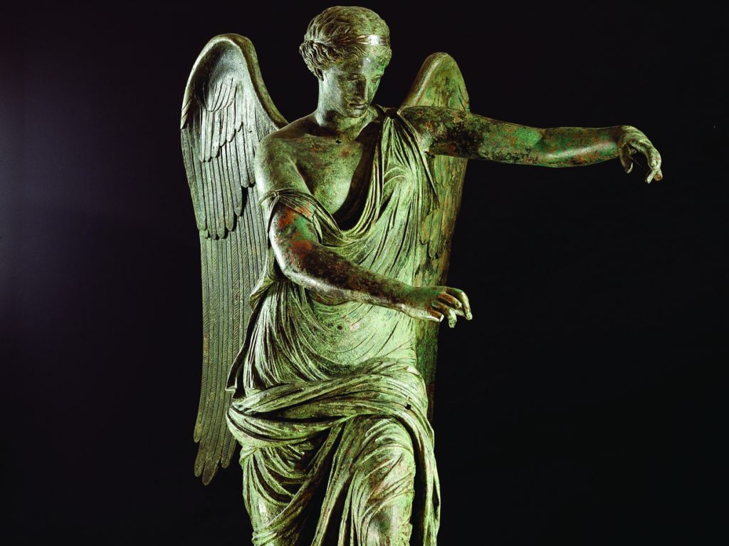 Dopo il ritrovamento si susseguirono numerose ipotesi sulla sua storia. Dapprima creduta un’opera ellenistica raffigurante Afrodite, eseguita verso la metà del III secolo a.C., giunta a Roma come bottino e modificata poi in Vittoria alata, sembra oggi superata. Un recente studio ha proposto che si tratti piuttosto di un’opera di età giulio-claudia; la presenza di questo straordinario bronzo a Brescia sembra legata al dono che potrebbe avere fatto alla città dopo il 69 d. C. l’imperatore Vespasiano, come ex voto per il successo militare ottenuto tra Brescia e Cremona sugli eserciti rivali di Ottone e Vitellio.
