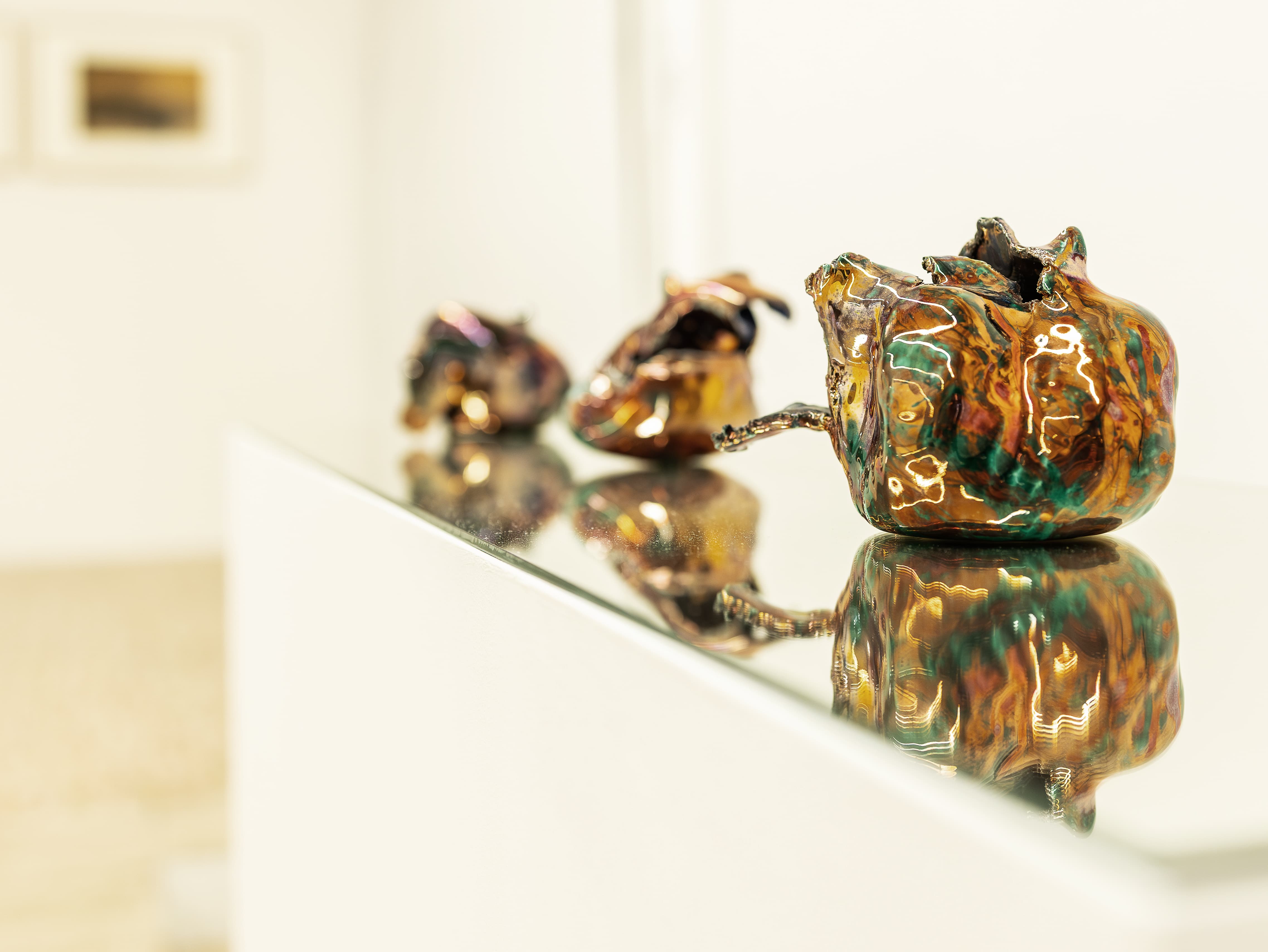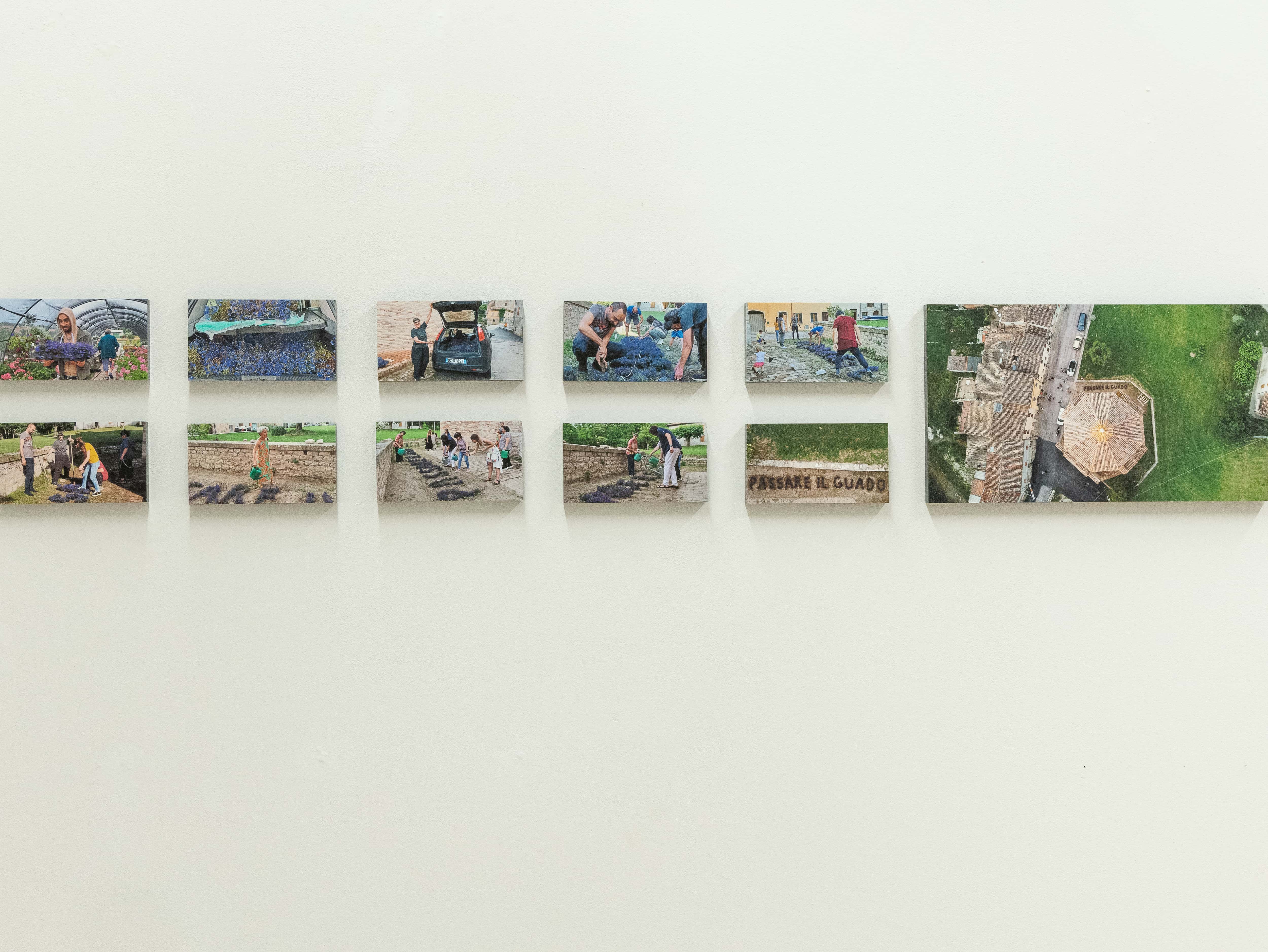 Prosegue in questa direzione anche l’intervento site specific di Gea Casolaro Passare il guado, restituito in mostra attraverso un contributo fotografico che immortala le varie fasi dell’azione svolta con la comunità del quartiere delle Tinte, in una reinterpretazione del kintsugi, che ingentilisce le ferite di un territorio martoriato dall’alluvione del 2022.