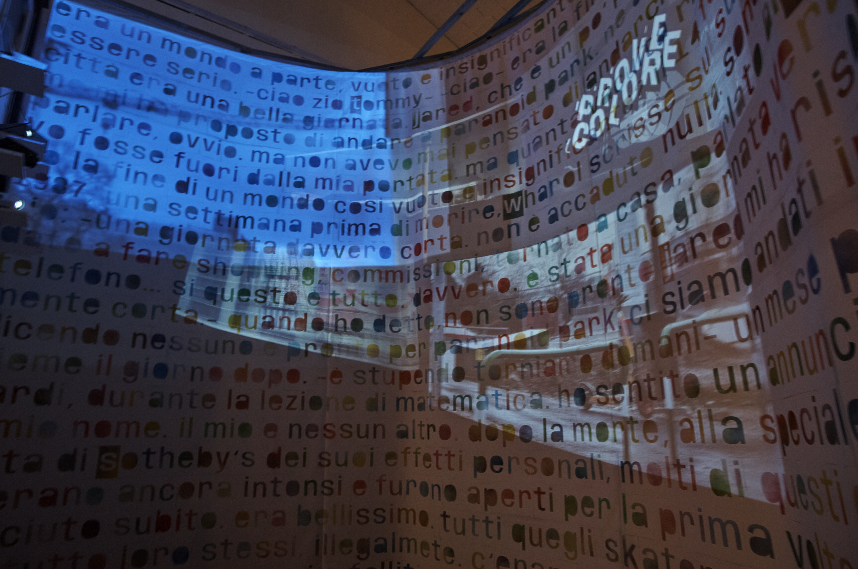 Appropriazione, stratificazione, multidisciplinarietà: sono queste le tre principali operazioni che caratterizzano la produzione del duo Prove Colore, a cui se ne aggiungono poi altre derivanti, come la citazione, la sovrapposizione e la stratificazione. Spot in è particolare un’istallazione dove su un telo sospeso di forma curva, dipinto con vernice spray attraverso stencil, scorrono video della città. Padova è ripresa camminando di notte, o all’alba, e vi si sovrappongono citazioni tratte dallo scritto di Ai Weiwei su Andy Warhol e dal lungometraggio Paranoid Park di Gus Van Sant. L’opera delimita uno spazio liminale incastrato tra un esterno urbano e lo spazio di ricerca artistica. La risultante è una commistione di elementi, i quali durante l’attraversamento dell’istallazione, sospendono l’area interessata e sfumano il confine delle due realtà limitrofe “Uno Bis” e Padova, che entra così a far parte della memoria collettiva dello spazio.