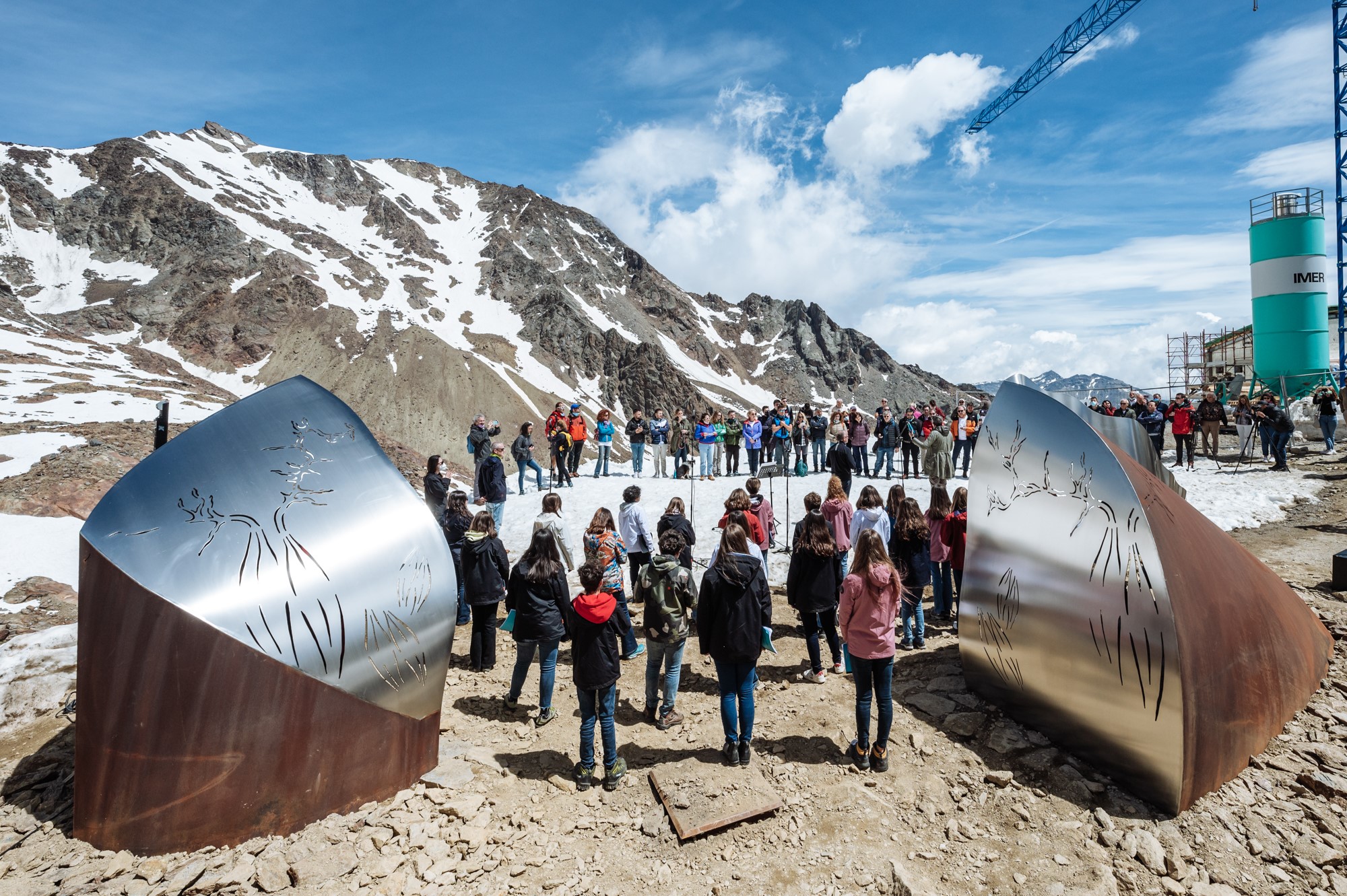 Tutto ha origine da un brano nato dai laboratori musicali organizzati dal Collettivo OP (già nel Padiglione Italia della Biennale Architettura 2018), nei comuni di Pejo e dintorni. Il piccolo componimento (che inizia con il verso riportato in questo articolo), è stato poi arrangiato dall’Orchestra e Coro di Voci Bianche dell’Accademia Teatro alla Scala ed eseguito sabato 3 luglio 2021 a 3000 metri d’altitudine dagli stessi bambini, emozionati e prevedibilmente un po’ intirizziti. Fine dell’evento, si abbassa il sipario (in questo caso, mai alzato), qualche flash e ognuno fa ritorno a casa. Invece no, perché “Uno di Un Milione” è appena iniziato: prosegue nel QR code delle borracce (guai a chiamarle souvenir del marketing) dove, avvicinando la fotocamera alla bottiglia, ognuno può riattivare una nota di quel canto della montagna e scoprire le fonti d’acqua della Val di Sole (sono disponibili sul sito unodiunmilione.com). E continua in una piccola stazione di posta che, d’ora in poi, abiterà in pianta stabile la montagna. Si tratta dell’installazione di Morgana Orsetta Ghini del Collettivo OP: due piccole cappelle votive che diffonderanno l’ascolto del brano per tutte le estati che verranno (e che in inverno, poi, saranno impacchettate e pronte per il letargo, come ci racconta l’Azienda per il Turismo Val di Sole). Opera che, forse, pecca un tantino di immediatezza (il cor-ten e l’acciaio bissano un po’ troppo l’intorno), ma non dimentichiamo che è un lavoro pensato per essere installato a 3000 metri (quindi con funivie e mezzi sospesi del caso), e destinato ad abitare un paesaggio – quello alpino – che ancora non sappiamo se e come sarà ospitale. Parlando di metallo, dietro queste sculture si intravede ancora il ferro messo a contenimento delle trincee della Prima Guerra Mondiale. È già un fatto, dunque, il poter abitare la montagna con suoni alternativi alle bombe.