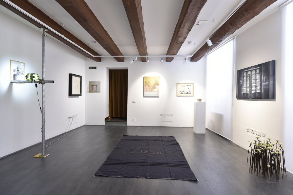 Il trait d’union tra la prima e la seconda sala è dato da un lavoro storico di Pino Pinelli, che – in un immaginario passaggio generazionale – dirotta l’attenzione verso l’ascia#2 tratta dalla serie dei Corpi defunzionali di Iacopo Pinelli, uno dei più giovani artisti in mostra. Al contempo la grande tela figurativa di Mauro Evangelista apre un ragionamento sulle possibili declinazioni del segno e del colore, a cui partecipano anche Paolo Bini, Maurizio Meldolesi, Marco Raparelli ed Enrico Pulsoni, le cui tavole fluttuanti trovano il proprio corrispettivo spaziale nei taglienti caratteri di acciaio con cui Cristiano Berti compone Incubo Succubo. Viceversa, a terra, il discorso si sposta sul versante scultoreo e si manifesta con l’acceso contrasto materiale e concettuale che si attiva tra il lavoro in marmo arabescato e acciaio corten di Antonio De Marini, quello in resina e metallo di Luca Cerioni e i quattro straordinari modelli illustrativi del processo di ideazione dell’opera Rette di Luce nell’Iperspazio Curvilineo realizzati da Maurizio Mochetti.