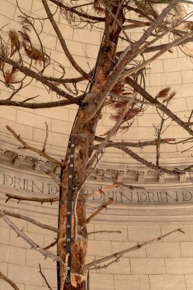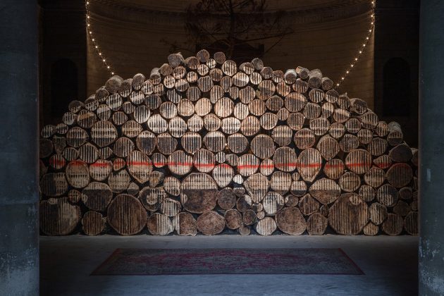 Un’installazione imponente, realizzata utilizzando i materiali di scarto che i cittadini sono ormai disabituati a notare o elementi naturali, disponibili grazie a una collaborazione con il giardino botanico e la gestione del parco forestale delle Landes de Bordeaux, dove poi torneranno come opera ambientale. Al centro della riflessione dell’artista c’è la complicata relazione tra uomo e natura, tenendosi lontano dallo stereotipo di un conflitto che vede l’essere umano come un violento prevaricatore.