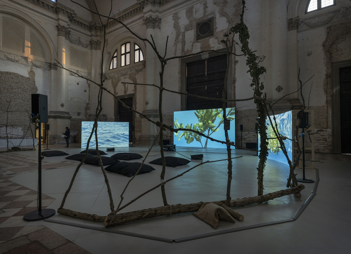 Proseguendo il nostro circuito, ci spostiamo a piedi verso Campo San Lorenzo, dove troviamo la Chiesa di San Lorenzo, sede di Ocean Space, un centro fondato e guidato da TBA21–Academy, che presenta mostre, ricerche e programmi pubblici che catalizzano l’alfabetizzazione e la difesa degli oceani attraverso le arti. In questo periodo il centro ospita ben due mostre: Ocean! What if no change is your desperate mission? di Dineo Seshee Bopape e Ciguatera di Diana Policarpo, rispettivamente i capitoli 3 e 4 della serie The Soul Expanding Ocean, a cura di Chus Martinez. L’approccio di Bopape fonde indagine magica, curiosità storica, saggezza tradizionale, senso di e per l’illusione, immaginazione e speranza, per creare un’opera sull’azione post-post-coloniale in dialogo con l’Oceano, come “essere”. Con questa commissione l’artista muove un ulteriore passo verso il connubio tra la Terra e la memoria dell’Oceano.