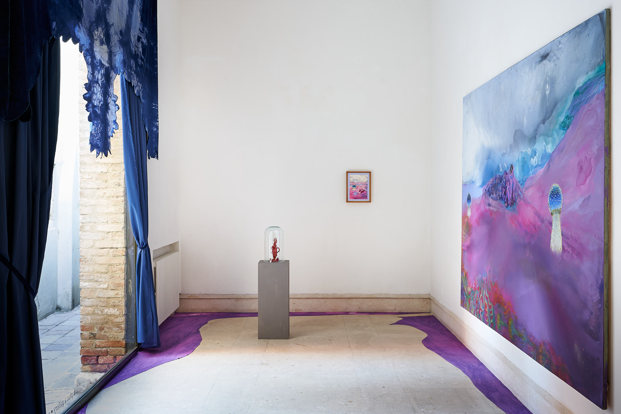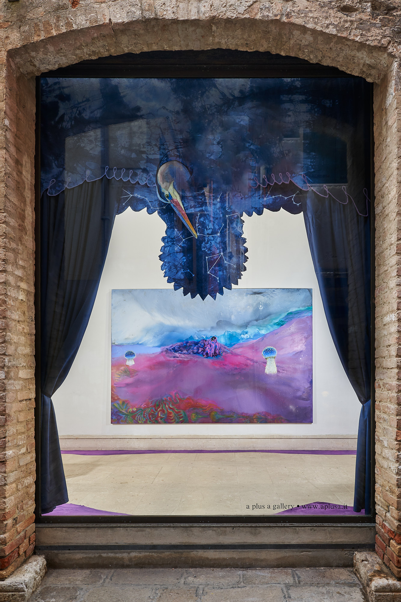 La vetrina della galleria, incastonata tra le calli di Venezia, diventa così un portale segreto, sul quale regna sovrano un airone dalla coda trapuntata di costellazioni, solo la prima di una numerosa serie di creature mistiche che ci accompagnano nel percorso.