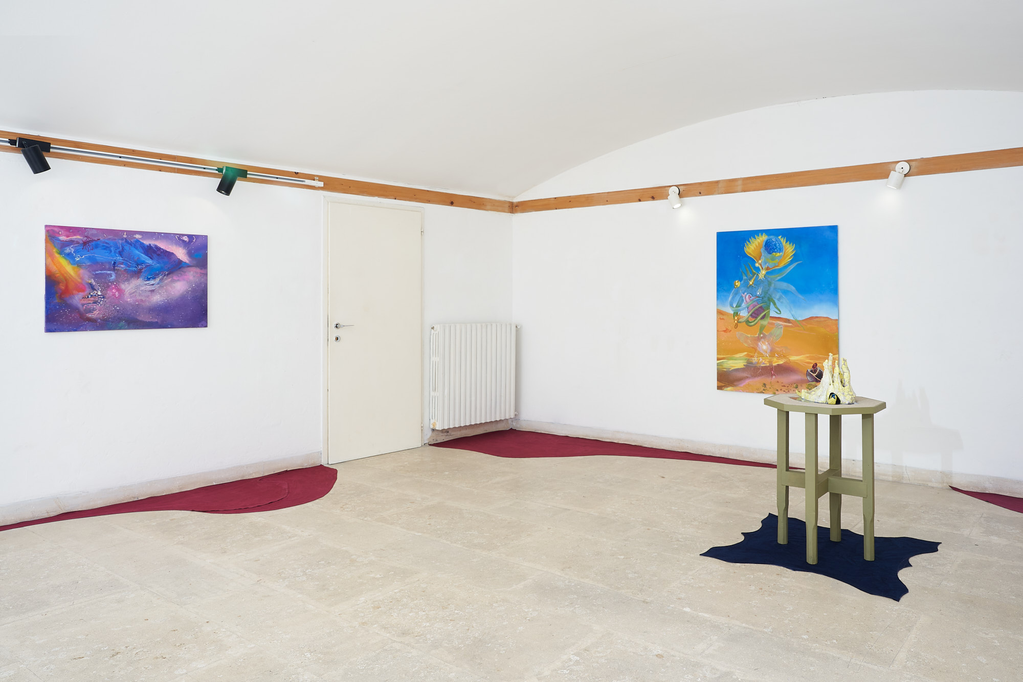 Ogni lavoro esposto, dunque, può essere visto come un portale cangiante, che porta verso l’esterno, ma anche verso la nostra interiorità. Questa idea di portale viene accentuata dall’allestimento stesso della mostra: sul pavimento della galleria hanno trovato posto stralci di tela colorata disposti in sinuosi sentieri che ci trasportano dentro ogni opera, dove si concretizza quella visione di cui parla l’artista quando scrive: «Attraverso i miei dipinti crittografo il mio mondo utopico, così come lo comprendo e lo desidero io».
