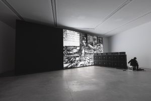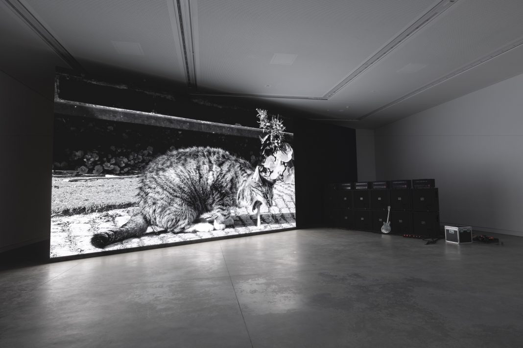 DESASTRES è un progetto sul rumore sperimentale che sincronizza suono e immagine, e prende la forma di una performance durazionale da solista resa in un’installazione. L’artista va in scena durante le ore di apertura della Biennale di Venezia, per un totale di 200 giorni. Si esibisce dal vivo nel padiglione Australia usando una chitarra elettrica come generatore di segnali in un amplificatore di massa per improvvisare blocchi di rumore, feedback saturato e intensità discordanti che scatenano un diluvio di immagini su una parete autoportante a LED che va dal pavimento al soffitto. Le immagini sono estratte da un flusso di parole che sono state inserite in una ricerca libera su diverse piattaforme online. L’indicizzazione massiva caotica: un pantano di immagini sconnesse e disparate generate a caso. Non c’è un vero e proprio tema, ma la fusione di suono e immagine invita il pubblico a interpretare e a dare un senso. Lo scopo è creare una specie di allucinazione, di euforia da disorientamento e di sfinimento da confusione.