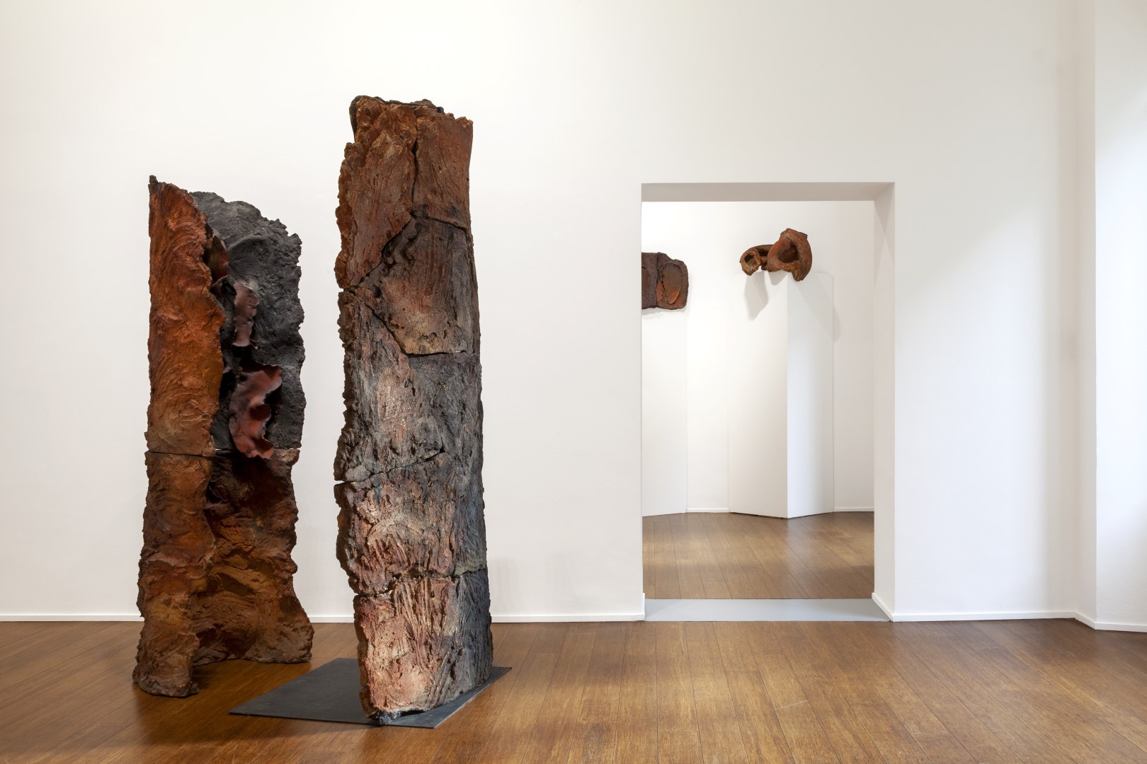 Dal rasoterra di una Deriva (Sole) fino alla prestante verticalità di una Annunciazione (Colonna), terracotta vetrificata che si divide tra l’effetto di blocchi massicci, e quello di carta velina mossa dal vento. Duecentodieci centimetri d’incombenza. Catartica, come la cima di una fornace. Come l’accoglienza trascendentale offerta sull’altro lato da Annunciazione: appena 10 centimetri in meno e una struttura a misura d’uomo, che smarca il concetto di statuaria da quello di prodotto autoreferenziale.