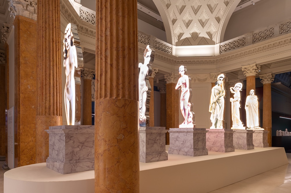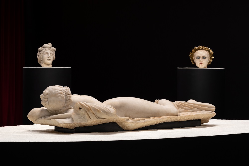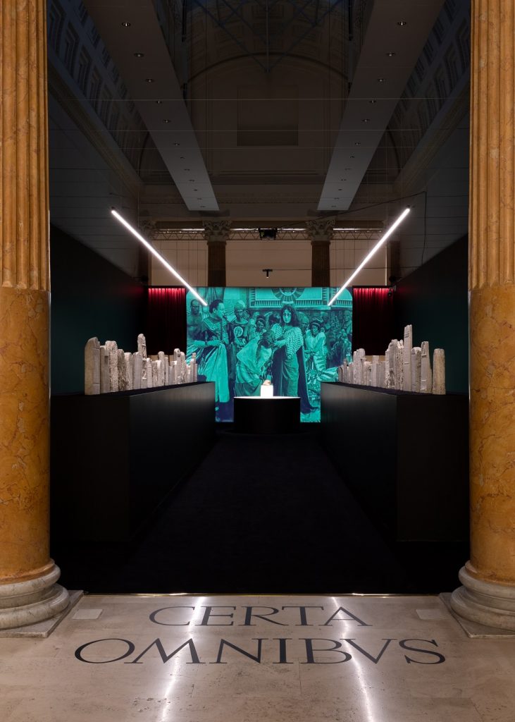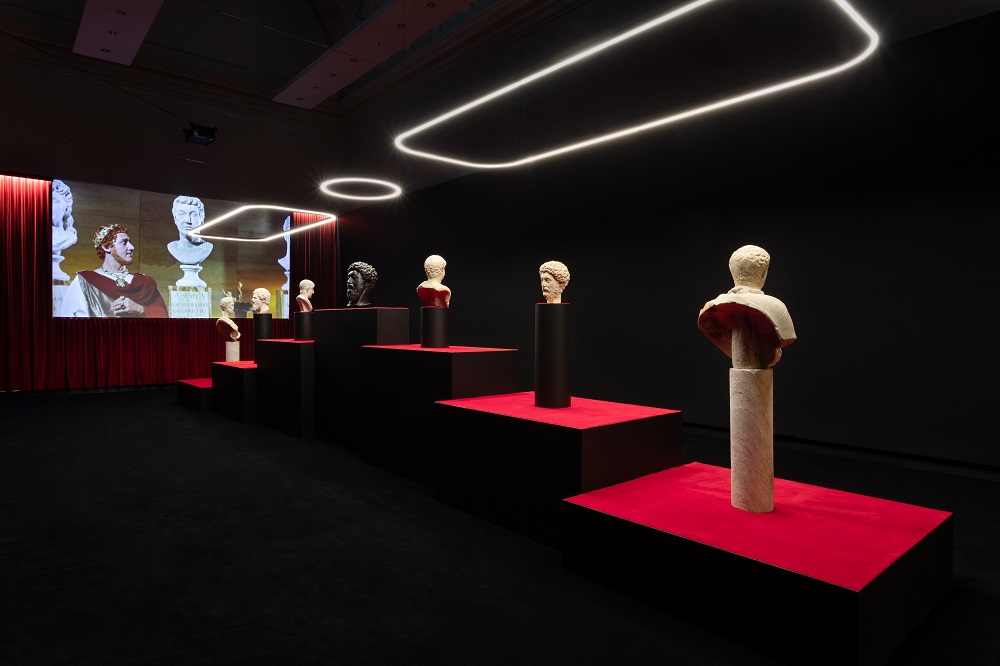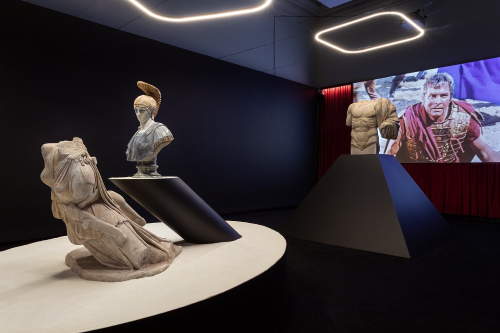 Aver accompagnato le opere, vuoi classiche che contemporanee, con proiezioni di frammenti estratti da film che hanno non solo segnato la storia del cinema (La calata dei Barbari, Il Gladiatore, Sebastiane, Spartacus, Cleopatra, Cabiria, Fellini Satyricon, Satyricon, Mio figlio Nerone, Nel regno di Roma), ma anche forgiato l’immaginario collettivo circa la visione dell’epoca classica, è sottolineare come il cinema non si sia mai creato il problema del rapporto con la classicità, che, contrariamente, ha fortemente influenzato e condizionato tutte le altre discipline delle arti visive. Disinibizione che lo stesso Vezzoli rivendica nel suo famoso video Trailer for a Remake of Gore Vidal’s Caligula (2005). Perché quello che auspica l’artista è: “abbiamo un grande patrimonio, è necessario trovare il modo per riattivarlo” (su tutti: la serie dei busti di Antinoo truccati con la celebre saetta di David Bowie), perché in esso ci sono anche le radici della cultura occidentale, nella quale viviamo.