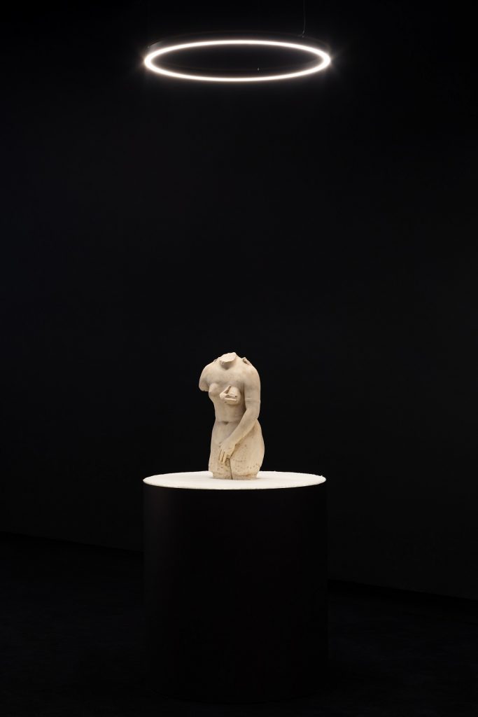 Fulcro dell’intera mostra, da dove tutto si irradia e da dove tutto prende l’abbrivo, è la Rotonda nella quale sono state esposte, sopra elevatissimi piedistalli, sei energiche sculture luminose come dei grandi lightbox, parte del progetto 24H Museum (2012). Un percorso, quello di avvicinamento alla classicità, quindi, intrapreso da più di dieci anni, perché in essa c’è del vero, la verità, e con essa si capisce il presente (famosi gli esempi citati da Vezzoli: in Svetonio vede la descrizione di Trump, nei gladiatori gli attuali calciatori). Un approccio che lo stesso Vezzoli definisce “derivativo: cerco di riattivare qualcosa di preesistente, di riconnessione al presente”. Attraverso la classicità cerca, dunque, di innescare quello che gli inglesi chiamano l’“eye contact”. Perciò realizza tali sculture come dei ritratti di diva (come Sharon Stone, Anita Ekberg, Jeanne Moreau) con i corpi di divinità classiche (come Venere, Afrodite, Menade), tutte, però, con gli occhi della madre dell’artista. Così elide il tempo, crea un unico grande presente, legittimando il ruolo fondante, nonché generativo, della donna di tutto il processo.