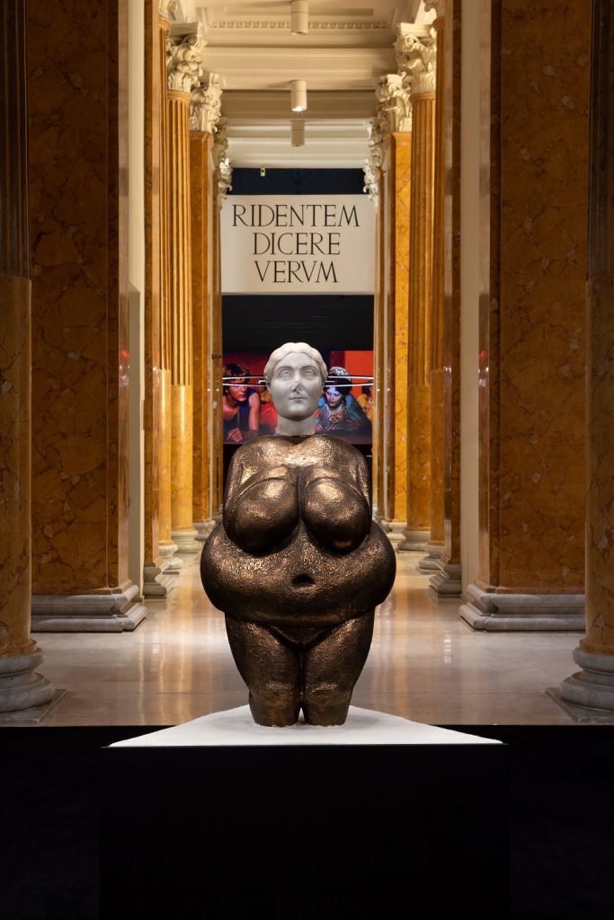 VITA DULCIS. Paura e desiderio nell’Impero Romano, prodotta dall’Azienda Speciale Palaexpo con il Museo Nazionale Romano e lo Studio Vezzoli, piuttosto che una mostra, è -per chi scrive- una grande unica opera realizzata dall’artista bresciano. Nella quale amalgama i suoi interessi, le sue passioni, le tematiche che più gli stanno a cuore, fulcro della sua elaborazione artistica. Una maestosa installazione che, dalla Rotonda centrale, tentacolare, si espande nelle successive sei sale circostanti, dando corpo a quei macro-temi ben chiari a Francesco Vezzoli: vita, morte, amore, desiderio, potere, ambiguità (PARA BELLUM, ANIMULA VAGULA BLANDULA, DUX FEMINA FACTI, CERTA OMNIBUS, RIDENTEM DICERE VERUM, UBI POTENTIA REGNAT e MIXTURA DEMENTIAE: questi i titoli delle singole sale, tratti da Vegezio, dall’Historia Augusto, Virgilio, Orazio, Seneca). Temi forse tanto vasti e ordinari che vogliono, però, esaltare la complessità di allora come di oggi. Nel più completo e attento bilanciamento di tutti gli elementi, in una somma di equilibrismi – sempre attingendo alle definizioni di Vezzoli.
