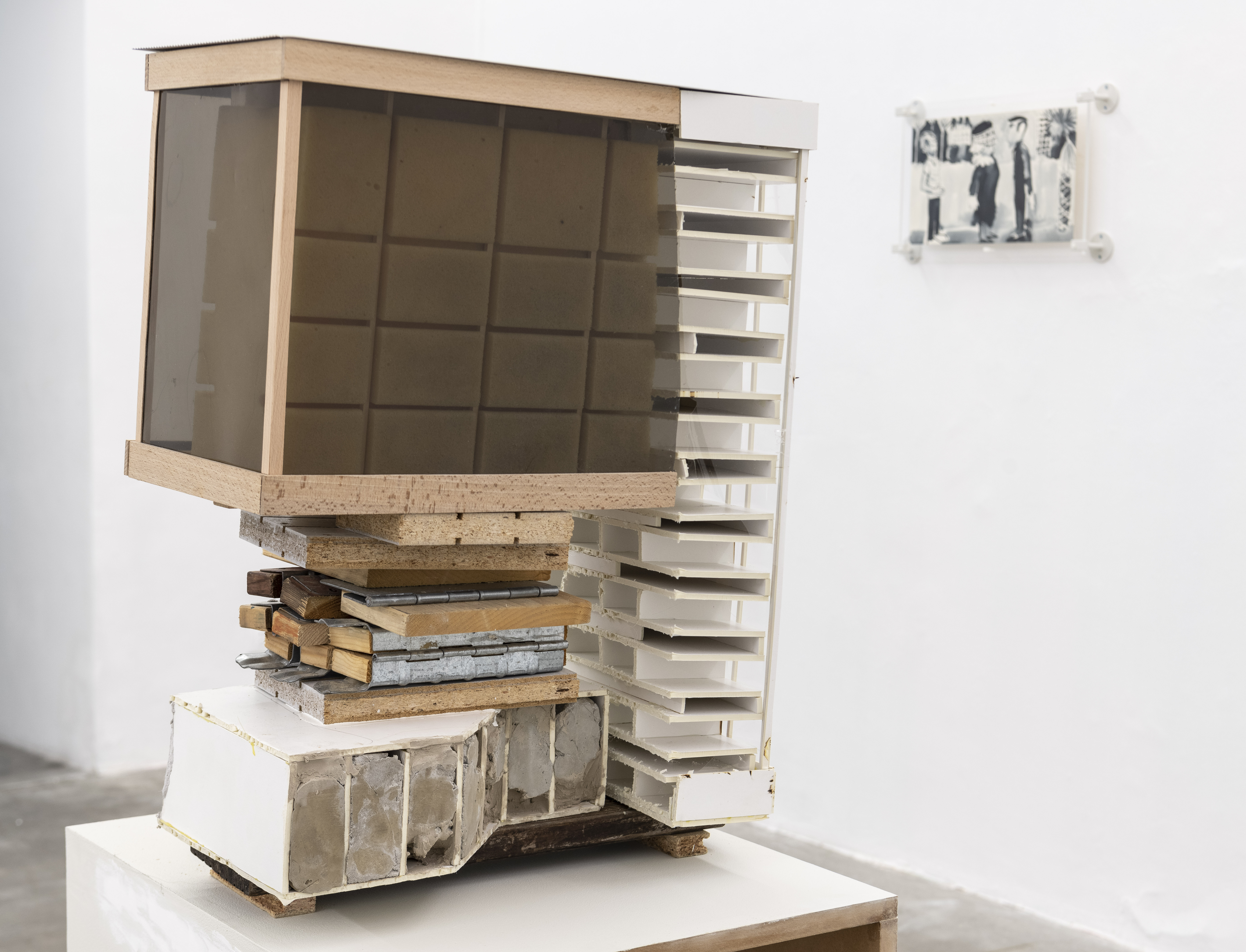 L’opera Site di Stan VanDerBeek (1927-1984), video dell’omonima performance che Robert Morris tenne presso il Surplus Dance Theater di New York nel 1964 con il volto coperto da una maschera realizzata da Jasper Johns, richiama il concetto di alleanza tra artisti che operano con linguaggi espressivi differenti nel tentativo di compiere una ricerca simile sulla significazione dello spazio. Morris venne ripreso mentre muoveva nello spazio dei pannelli di compensato come a voler costruire un ambiente attorno ad una modella nuda sdraiata su un triclinio (Carolee Schneemann nei panni dell’Olympia di Edouard Manet). Altra fonte di importante ispirazione per gli artisti giovani e i curatori coinvolti è stato il corpus ritrovato di disegni di Patrick Angus, che ritraggono scene inedite rispetto alla scena gay newyorkese solitamente cara all’artista. Nella selezione di fogli esposti emergono piuttosto personaggi solitari, riflessivi, immersi in ambienti intimi, alle volte solo corpi appena abbozzati. Il filo conduttore tra passato e presente viene qui concretizzato nel display progettato da Tomaso De Luca, alcuni pannelli in plexiglass che inglobano i disegni di Angus e che diventano anche una crasi tra arte visiva e spazio architettonico che omaggia il concept della mostra. Le sculture dall’aspetto precario dello stesso De Luca appartenenti alla serie Gewöhnen 189; 10; 68; 20 sono qui esposte. Realizzate con materiali recuperati dall’artista nelle case in cui egli stesso ha vissuto, portano come numero di serie i rispettivi civici reali, rendendo subito coerente anche l’imprinting affettivo ma al tempo stesso decadente della mostra.