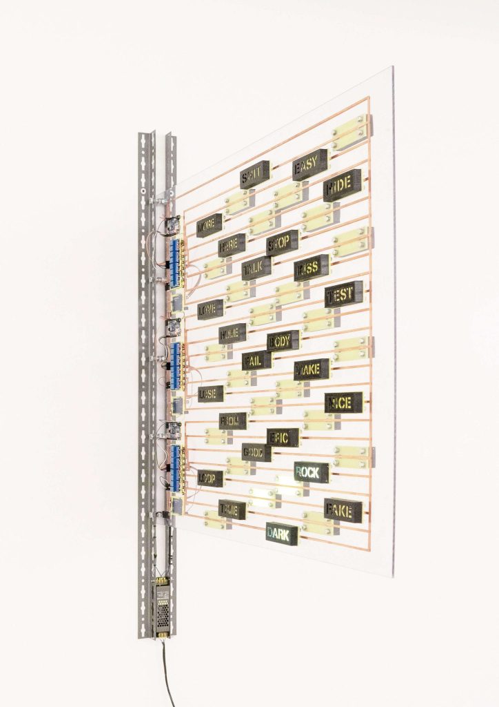 Che cosa voglia dire fare pittura oggi se lo chiede Enrico Antonello, che si è aggiudicato la decima edizione del Premio Cramum. L’opera Words. Are just words? riflette i tre aspetti principali, e ricorrenti, della sua ricerca: luce, suono e moto. Antonello, con chiari con riferimenti estetici e funzionali – rintracciabili nelle correnti architettoniche del Decostruttivismo e del Brutalismo – lscardina a bidimensionalità e l’uso del mezzo espressivo che le è proprio scegliendo di lavorare con materiali che non sono stati fabbricati per la pittura. La decontestualizzazione, evocativa del ready-made Duchampiano, concorre, insieme all’utilizzo di microcontrolliori, allam costruzione di una dimensione anche temporale e sonora fruibile in maniera del tutto analogica.
