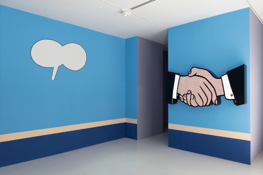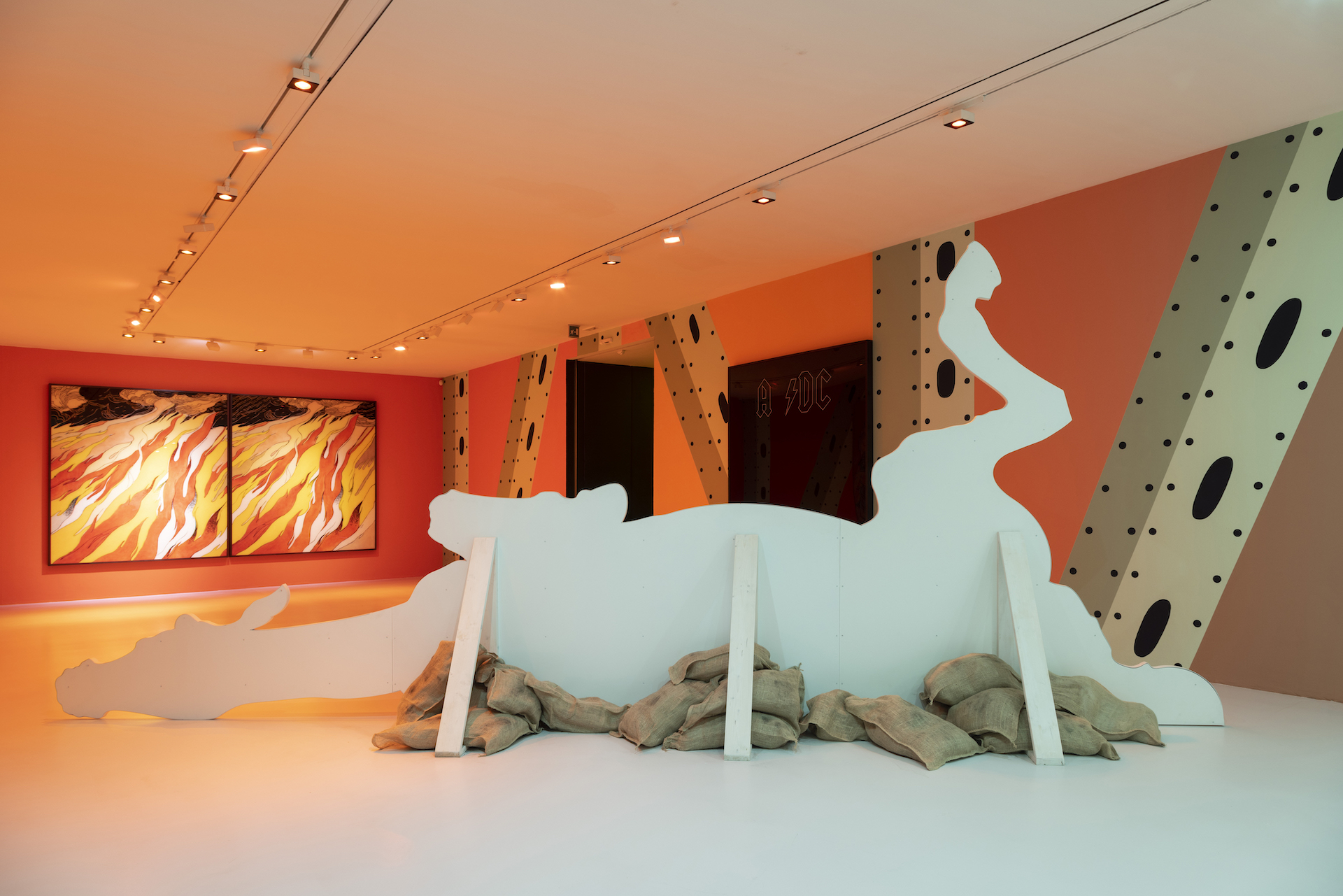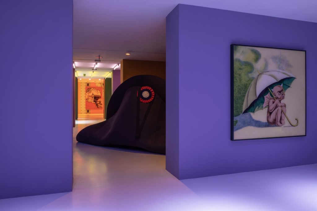 Ad accoglierci all’inizio del percorso espositivo ecco The Deal (2024), opera con cui l’artista sancisce il patto narrativo con il suo pubblico; le due mani che si sitringono sono il simbolo di un accordo, o la celebrazione di una nuova conoscenza, un gesto che ci espone inevitabilmente all’ignoto dell’altro, vulnerabili alla realtà o la farsa che ci racconta. Arriviamo quindi nella prima sala dipinta di un viola invadente che rappresenta l’oscurità condivisa dalla tempesta e dalla guerra, un tema sicuramente riconducibile al famoso Bonaparte ma allo stesso tempo estremante attuale e drammaticamente presente nella nostra quotidianità; un tam–tam rettangolare, Thunder Roll (2024) ci ricorda lo scoppio di un tuono mentre in What the Thunder Said (2024) l’artista abbina all’immagine di un fulmine una frase scritta dalla sorella mentre osservava dalla finestra l’arrivo di un temporale. Ad assistere scontento, di fronte c’è il diavoletto di Bitch Baby (2024) intento a ripararsi dalla pioggia, raffigurato sotto un ombrello che lo protegge dalle “lacrime di nostro signore”. Protagonista della sala è The Burial of the Dead (2024), la grande istallazione ispirata da uno dei primi cortometraggi di Walt Disney, The Skeleton Dance, tratto dalla serie animata del 1929 The Silly Simphonies.