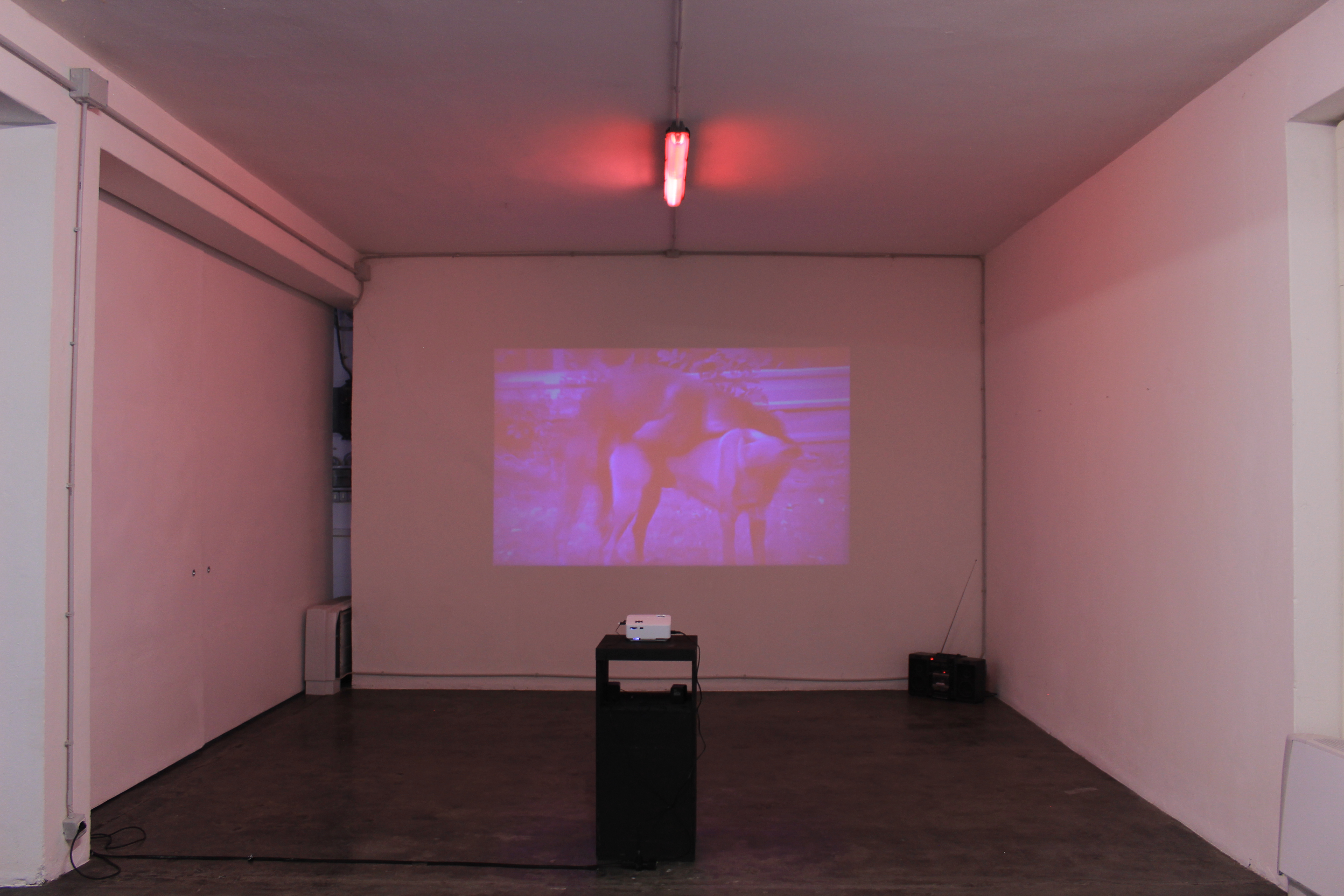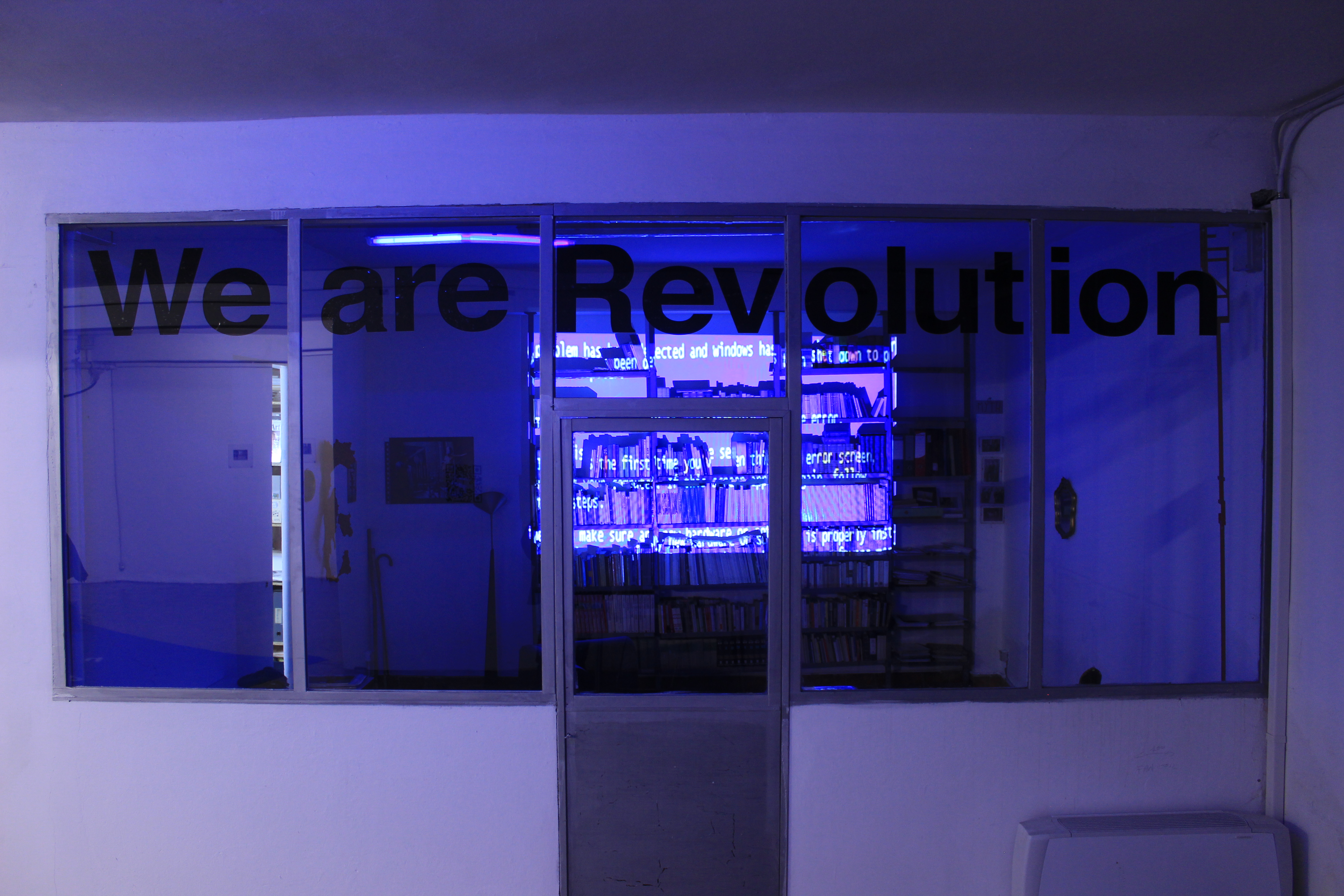 La prima opera ad accogliere i visitatori, tuttavia, non concepisce ancora una rivolta vera e propria, ma l’impossibilità di attuarla in una situazione contemporanea bloccata e inerme. Solo avanzando e camminando nello spazio si può percepire questo “climax” verso la rivoluzione, che alla sua acme con l’ultimo video che, mostrando scene canine, sembra volerci invitare a ritrovare uno stimolo animalesco al mutamento. Ad aprire la mostra è quindi il video We are, in cui per pochi secondi appare la figura di una persona che saluta, subito sostituita dall’immagine di un bug elettronico, a dimostrare l’impossibilità di muoversi e animarsi all’interno di una condizione contemporanea così convulsa.