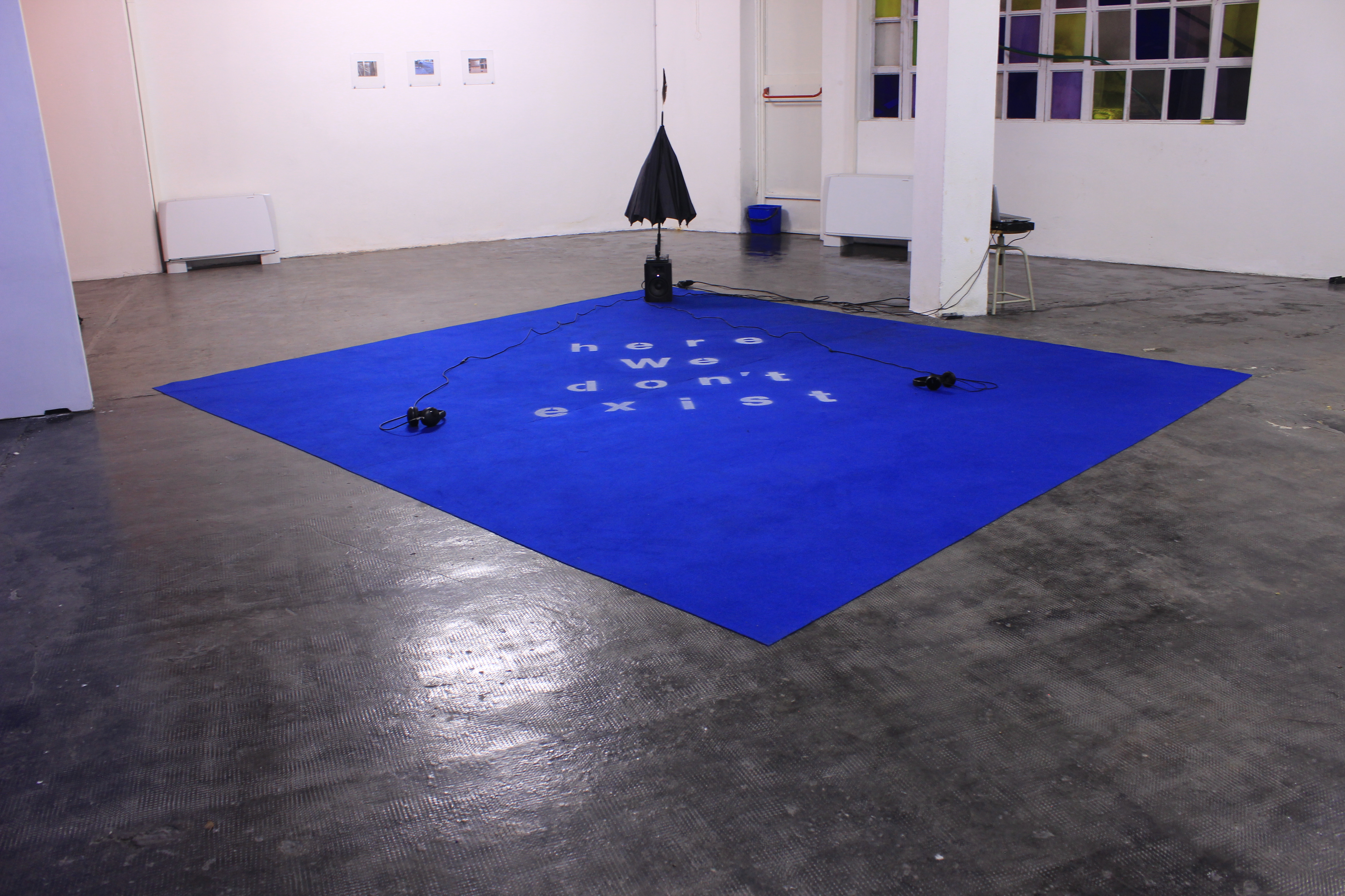 Segue un tappeto blu sul quale svetta la scritta bianca “Here we don’t exist”, uno spazio immersivo dove il pubblico può distaccarsi dalla realtà indossando un paio di cuffie e, attraverso l’ascolto di una voce che guida alla meditazione, ci si può alienare dalla schizofrenia del mondo. Questo atto, se vogliamo, rivoltoso, di mettersi in contattato con il proprio io, ha qui l’obiettivo di porsi in ascolto di se stessi, per capire quale posizione si occupa all’interno della realtà, per ritrovarsi e comprendere in quali dinamiche si è presenti e attivi. Questo l’invito di Nicola Tineo, che nell’installazione pone anche una piuma come simbolo della leggerezza con cui abbiamo sempre affrontato la socialità prima che ci venisse strappata via, contrapposta dalla presenza di un ombrello chiuso, l’iconico simbolo che caratterizza la ricerca dell’artista da un paio di anni.